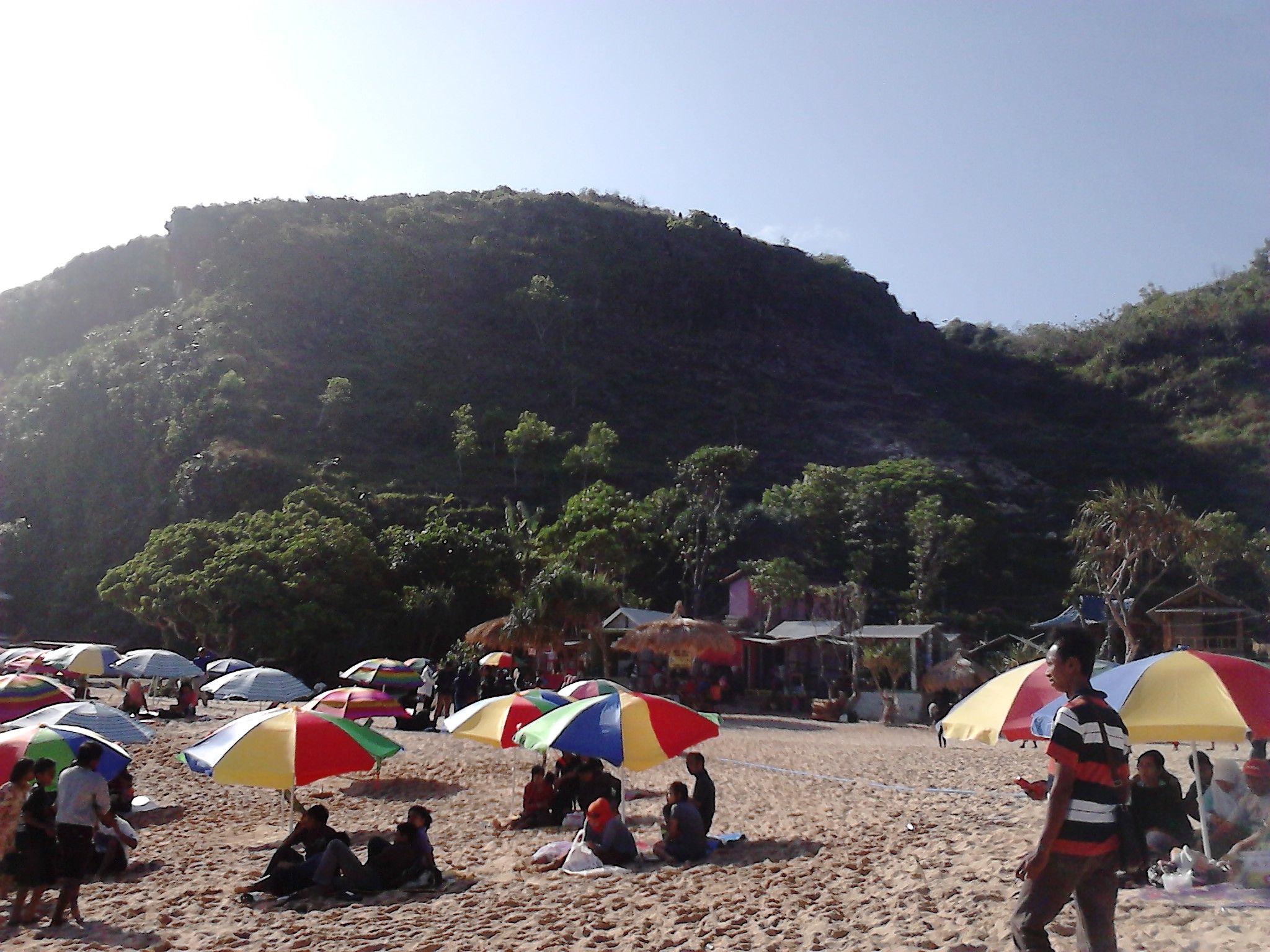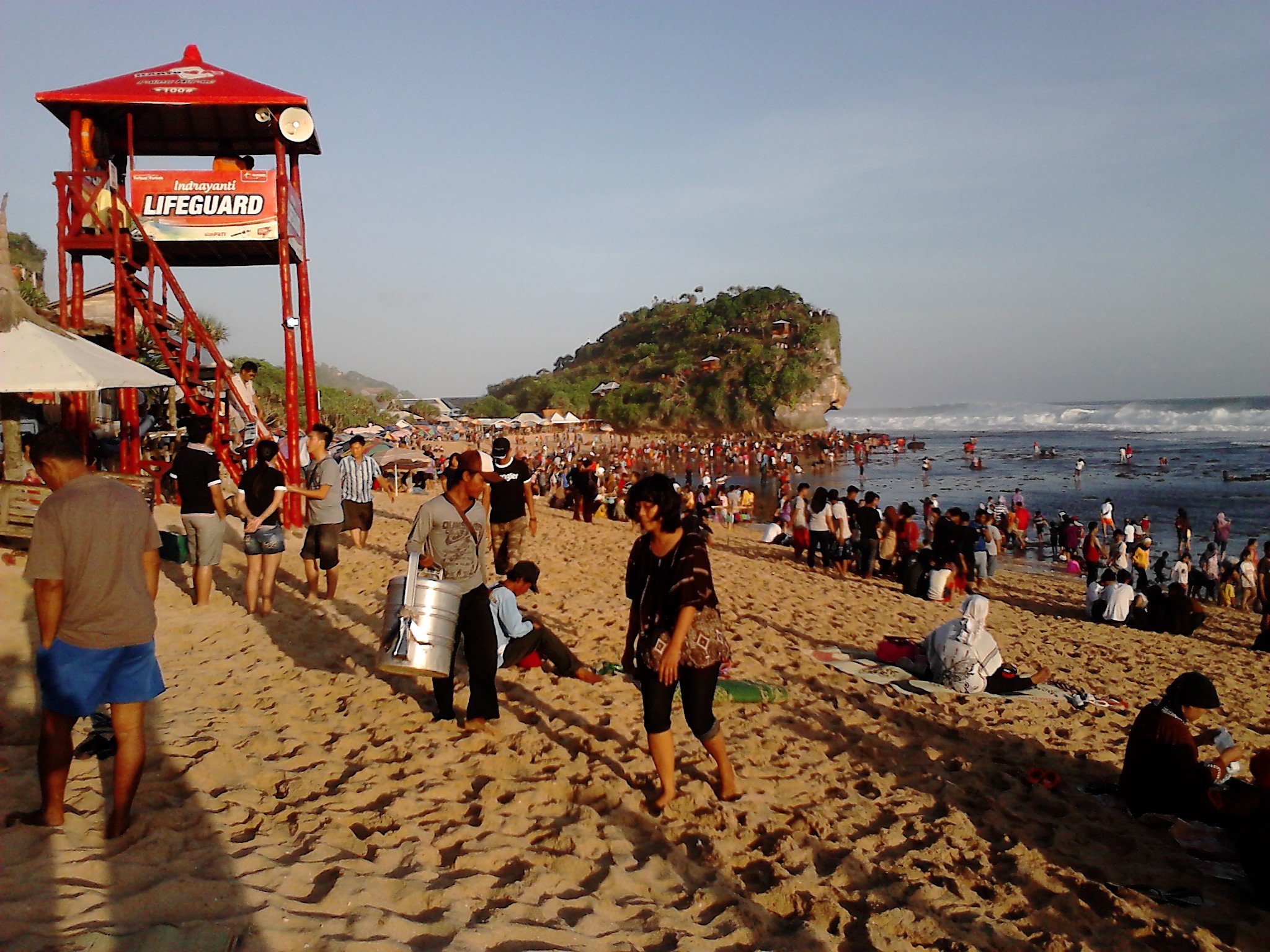 Kalau gue perhatikan, pengunjung di pantai-pantai Yogyakarta itu cenderung sopan. Semuanya berpakaian lengkap atas bawah, hanya satu-dua pemuda yang berani bertelanjang dada. Padahal, di Jawa Barat saja, rata-rata pengunjung pria bertelanjang dada dan pengunjung wanitanya memakai kaos / tank top dengan hot pants. Sayang ya, jadi nggak ada pemandangan tambahan deh #eh.
