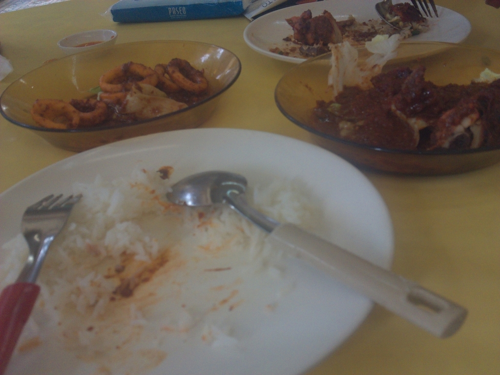 Pesanan dataaanggg. Saatnya mencicipi bagaimana rasa rendang ala Singaporean ini, dan ternyata… agak aneh! Ehehe. Bumbunya agak berbeda dengan rendang asli Padang, warnanya juga sedikit kemerahan, dan pedesss! Cumi pesanan gue… kayak debat anggota DPR gitu deeehhh, ALOT! Tapi rendang ayamnya empuk, kayaknya udah direbus dulu sebelum diolah. Gula untuk chinese tea gue dikit banget, nyaris terasa hambar seperti air putih dingin. Oh iya, kalau tadi gue nggak bilang minta gula, si pelayannya nggak bakal kasih gula lho. Es batunya juga disajikan terpisah. Rempongisasiii!