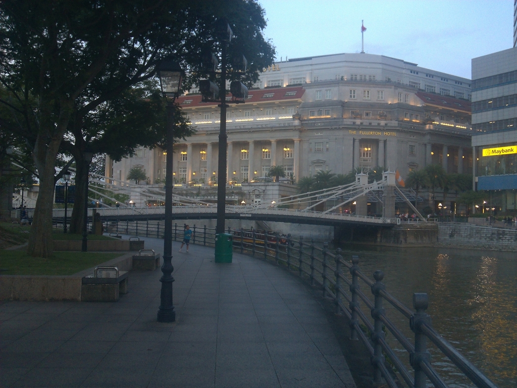 Setelah beberapa saat duduk-duduk galau menghadap Singapore River yang berkilauan tertimpa cahaya emas matahari sore, kami kembali melangkah. Sebentar kemudian, tampak The Fullerton Hotel yang historis nan anggun, menyapa kami bersama sebuah jembatan lain yang tak kalah indahnya: Cavenagh Bridge. Sementara di sisi yang lain, berdiri Asean Civilization Museum dan sebuah taman tempat patung Raffles dan patung-patung lain berada.