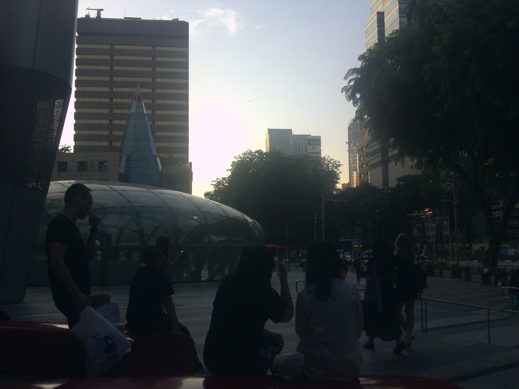 Kami terus melangkahkan kaki hingga kembali melalui Plaza Singapura. Gue sempat tertegun mendapati seorang ibu menjual tisu di trotoar Plaza Singapura, mengulurkan tisu yang tergenggam di tangannya pada setiap pejalan kaki yang melintas. Gue nyesel banget saat itu gue nggak berhenti dan memberi bantuan untuk ibu itu. Gue malah sama cueknya dengan warga Singapore yang lain, dan segera berlalu menuju stasiun MRT Dhobby Gaut.