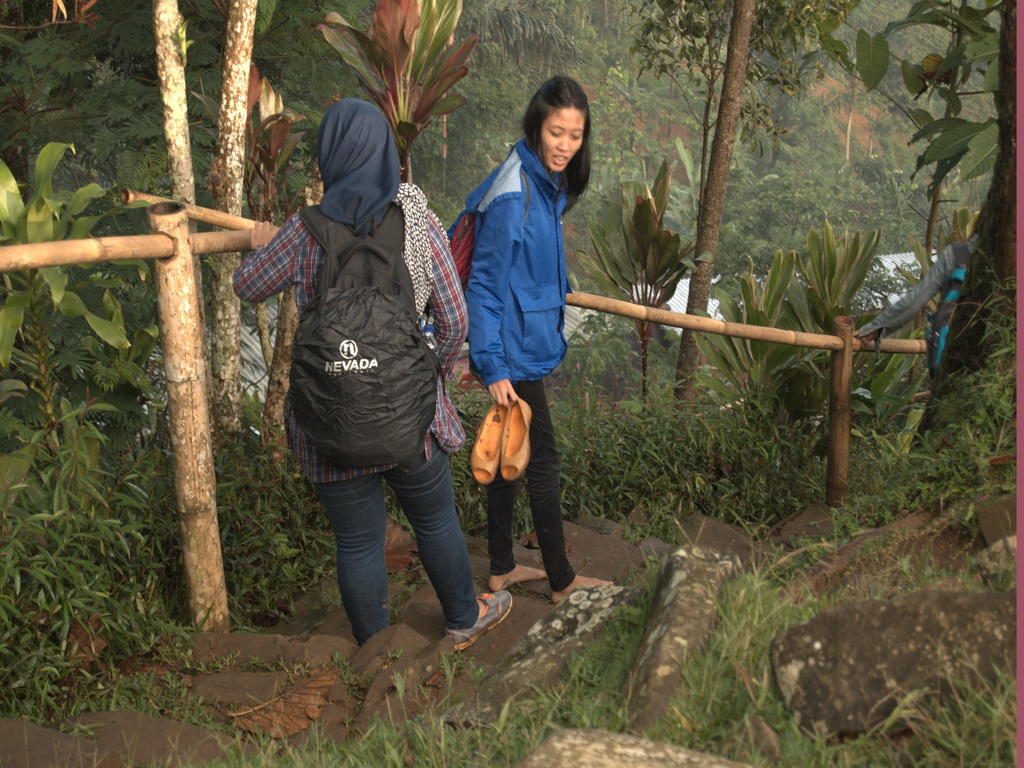 Akhirnya, beberapa saat kemudian, kami sampai di pintu masuk kawasan Situs Megalithikum Gunung Padang. Dari situ kami masih harus berjalan melalui jalanan yang lebih menanjak berjarak sekian ratus meter, sebelum akhirnya sampai di pos. Kami disambut oleh seorang abah-abah Sunda, mengenakan baju hitam dan ikat kepala ala Sunda seperti orang Baduy. Dia yang dipercaya menjaga dan mengelola Gunung Padang. Selain kami sendiri, ada sekelompok turis bule India yang juga baru saja sampai. Kami belum bisa naik ke atas, karena harus menunggu jam operasional, jadi kami beristirahat sejenak di pos.