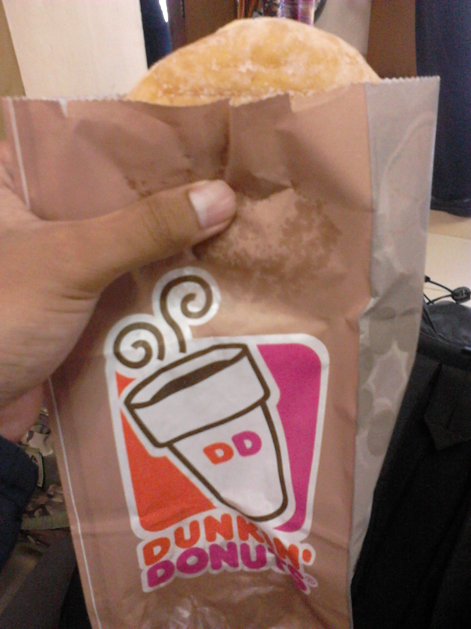 Seperti mengerti perasaan para calon penumpangnya, sekonyong-konyong beberapa petugas Air Asia masuk agak tergopoh-gopoh menjinjing dua bungkus plastik besar. Salah satunya berwarna cokelat dan berlogo Dunkin Donuts. Aha, it’s Air Asia delayed service! Sepotong donat dan segelas air mineral pun dengan cepat mendarat di kedua telapak tangan gue. Lumayan lah buat ganjel perut, dan gue cukup puas dengan pelayanan mereka meski sebelumnya sempat agak jengkel 🙂