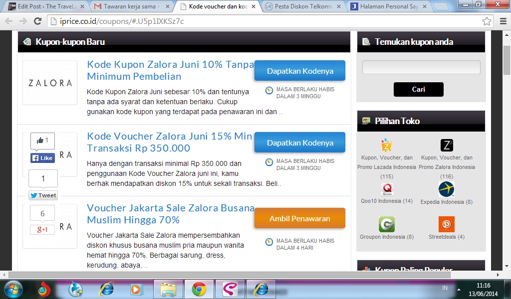 4)    Nah, setelah halaman terbuka, kamu akan langsung melihat sederet program kupon dari iPrice yang bisa kamu gunakan untuk situs belanja online tertentu, misalnya Kode Kupon Zalora Juni 10%, Diskon Lazada Telkomsel Anniversary Hingga 90%, dan masih banyak lagi.