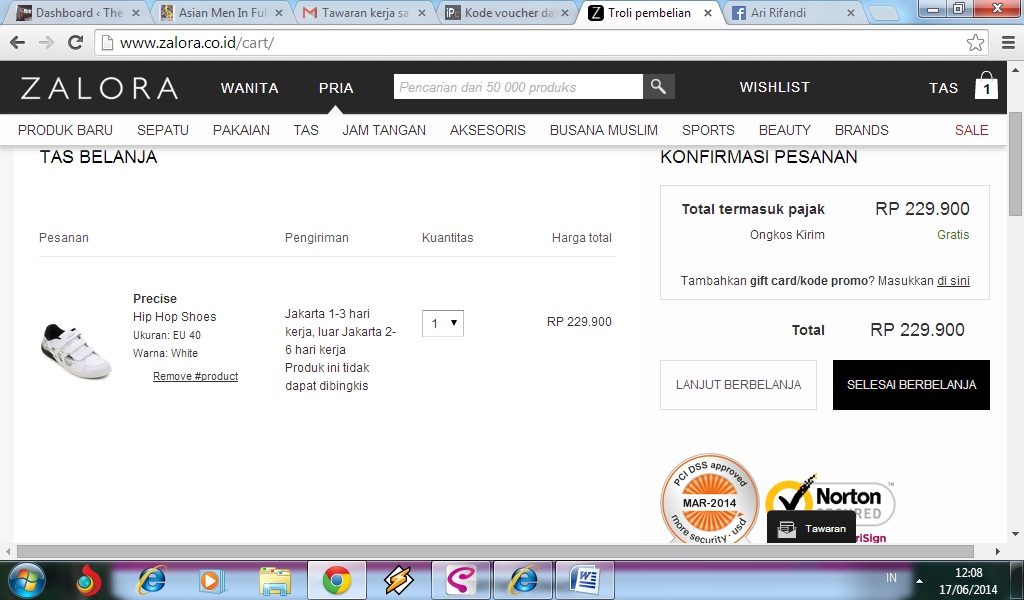 Gue nyobain Kode Kupon Zalora Juni 10% Tanpa Minimum Pembelian. Karena gue lagi butuh sepatu, gue pun langsung fokus dengan produk-produk sepatu pria Zalora. Gue lalu fokuskan lagi dengan sepatu jenis Sneakers yang memiliki rentang harga Rp 100.000,00 – Rp 250.000,00 — cari yang murah, bok! Pilihan gue jatuhkan pada sebuah sepatu Precise berwarna putih dengan gaya hip hop shoes. Setelah klik item yang bersangkutan, halaman langsung beralih ke halaman yang berisi detail pemesanan. Pada sidebar sebelah kanan, pada kotak Konfirmasi Pesanan, ada tulisan Tambahkan Gift Card / Kode Promo? Masukkan di sini. Klik di situ, lalu masukkan kode kupon yang tadi didapatkan. Klik enter, dan Voila! Harga yang semula Rp 229.900,00 berubah seketika menjadi Rp 206.910,00 saja! Terbukti bahwa iPrice bukanlah sebuah penipuan.