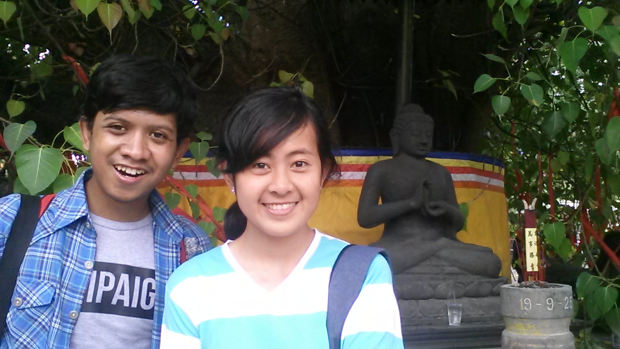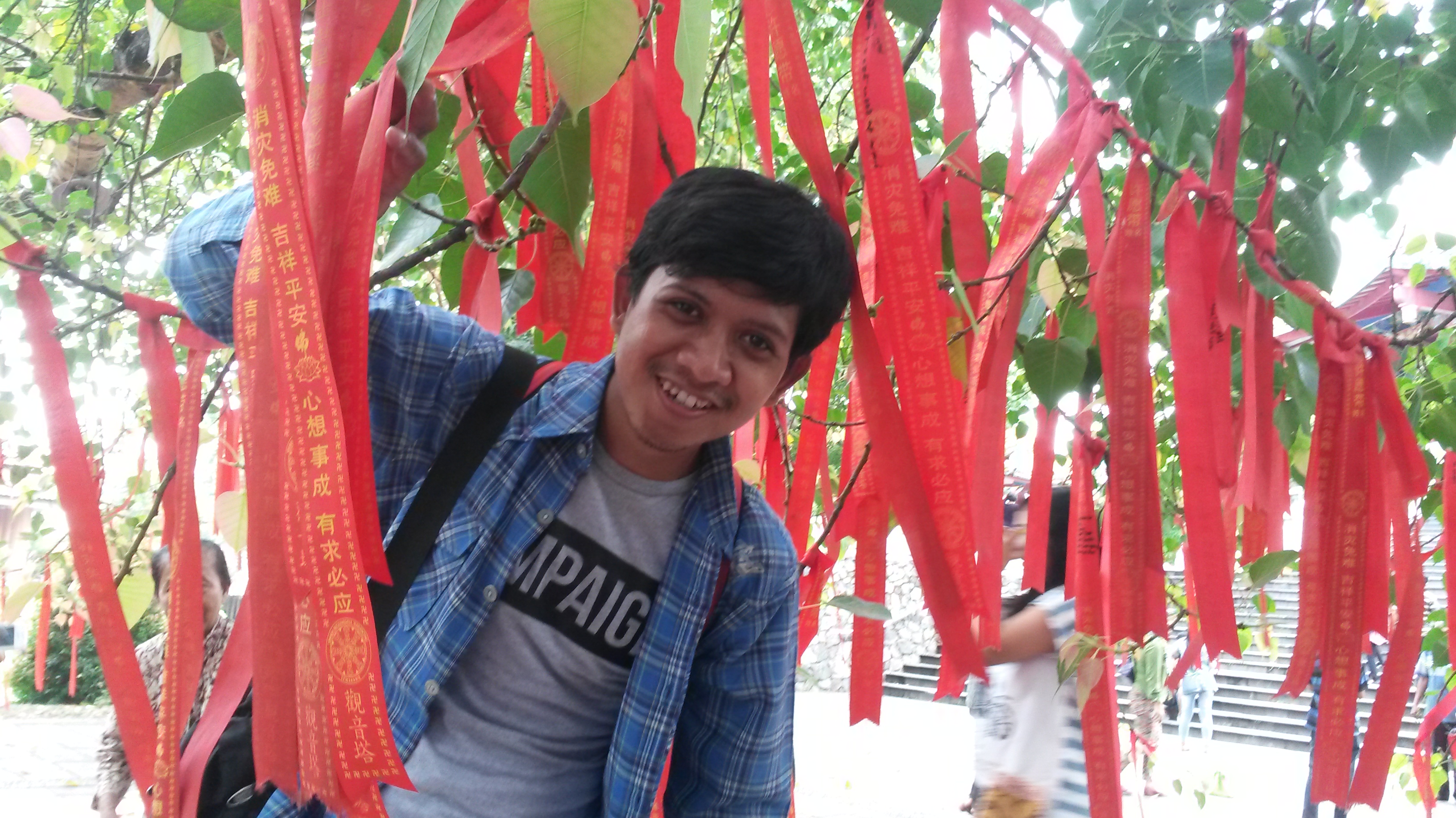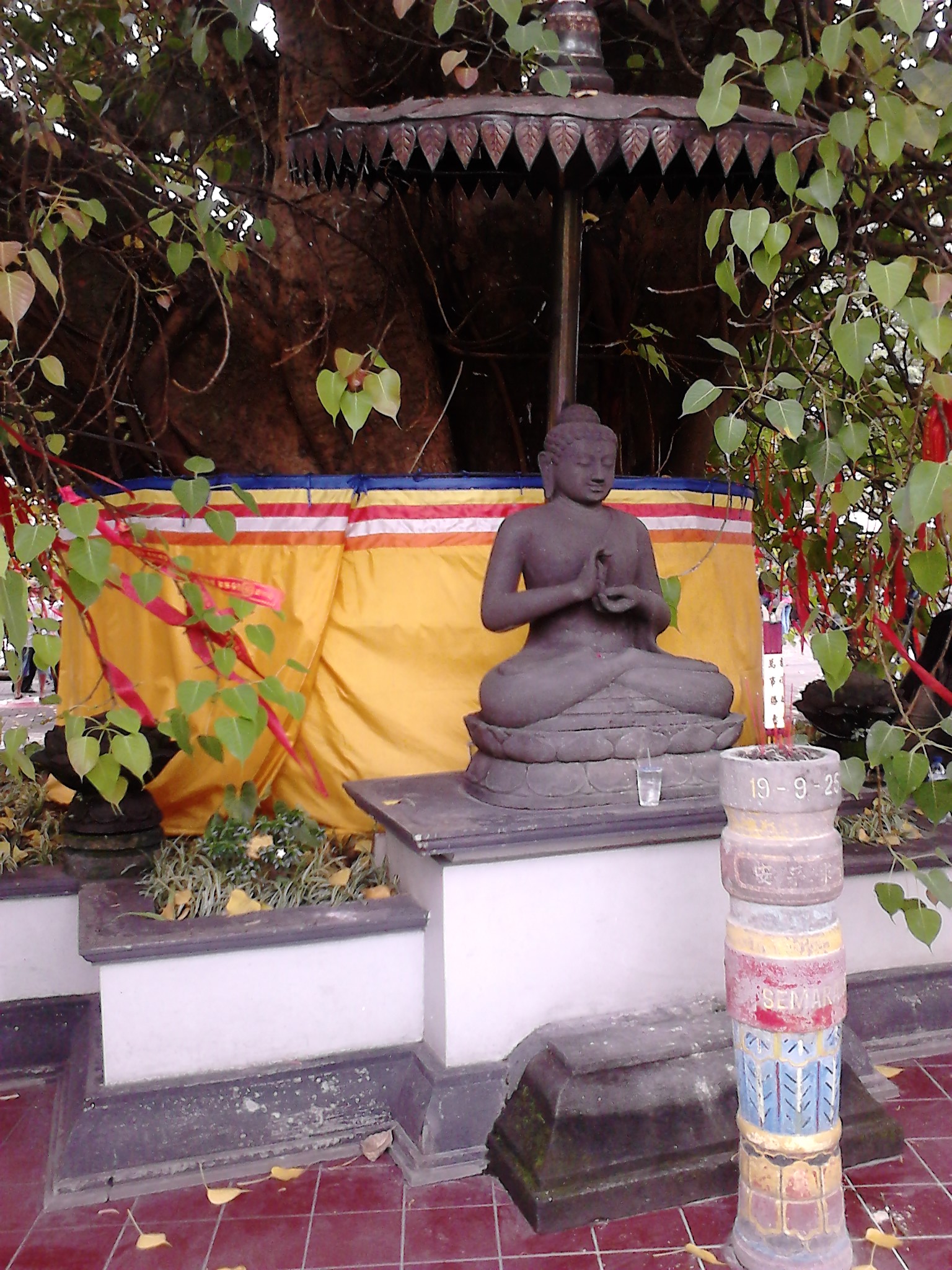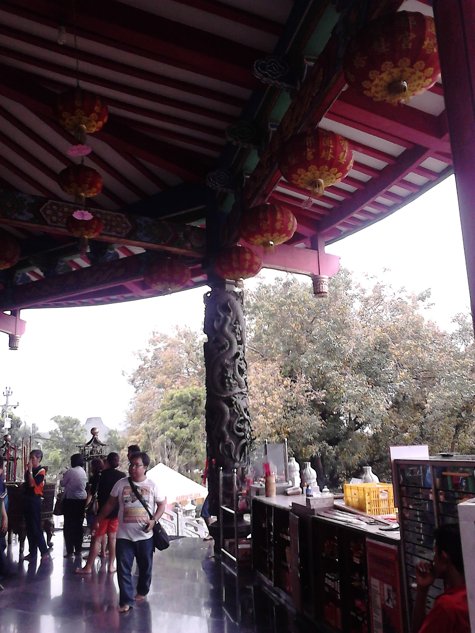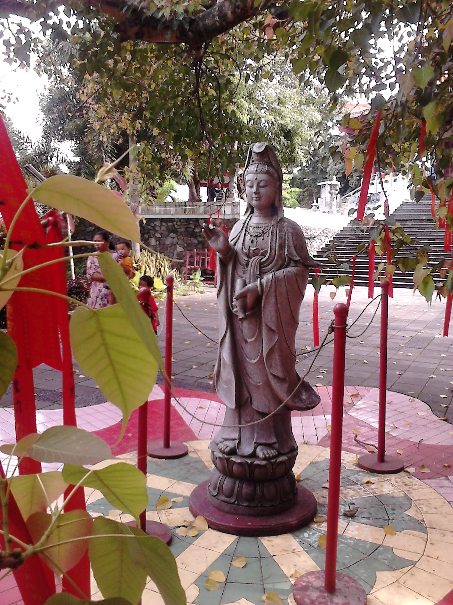 Baru sampai di pelataran depan, langkah kaki kami menuju pagoda tiba-tiba dihentikan oleh… hasrat untuk berfoto-foto! Ya, pita-pita harapan berwarna merah itu terlalu menyedihkan untuk dilewatkan begitu saja. Melambai-lambai tertiup angin di bawah Pohon Bodhi yang menaungi Patung Dewi Kwan Im (Dewi Welas Asih) dan dua buah patung Buddha. Sementara patung Buddha yang berwarna keemasan ditempatkan menghadap pelataran, patung Buddha yang berwarna gelap duduk tenang menghadap arah yang berlawanan.