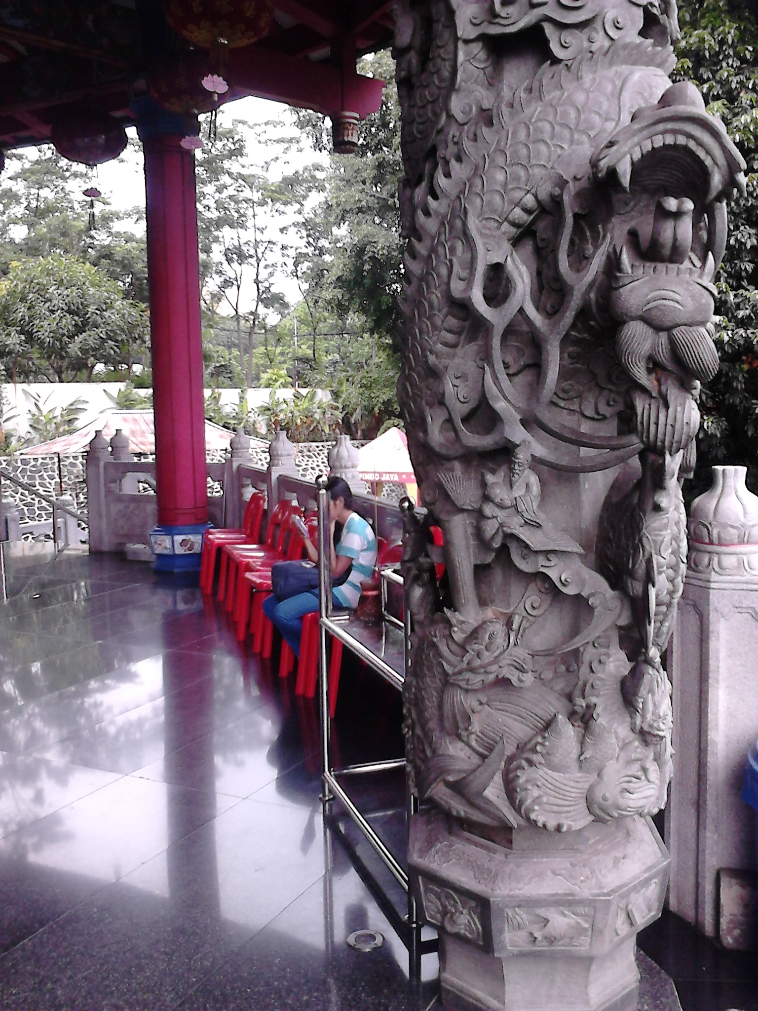 Menjelang menit-menit mengakhiri kunjungan, langit Semarang berubah muram berpoleskan awan kelabu. Sejenak kami sempat bimbang menentukan pilihan: apakah akan tetap tinggal di pagoda sejenak, atau langsung menuju destinasi berikutnya dengan resiko akan terguyur tumpahan hujan deras dalam perjalanan. Akhirnya kami putuskan untuk tetap tinggal.