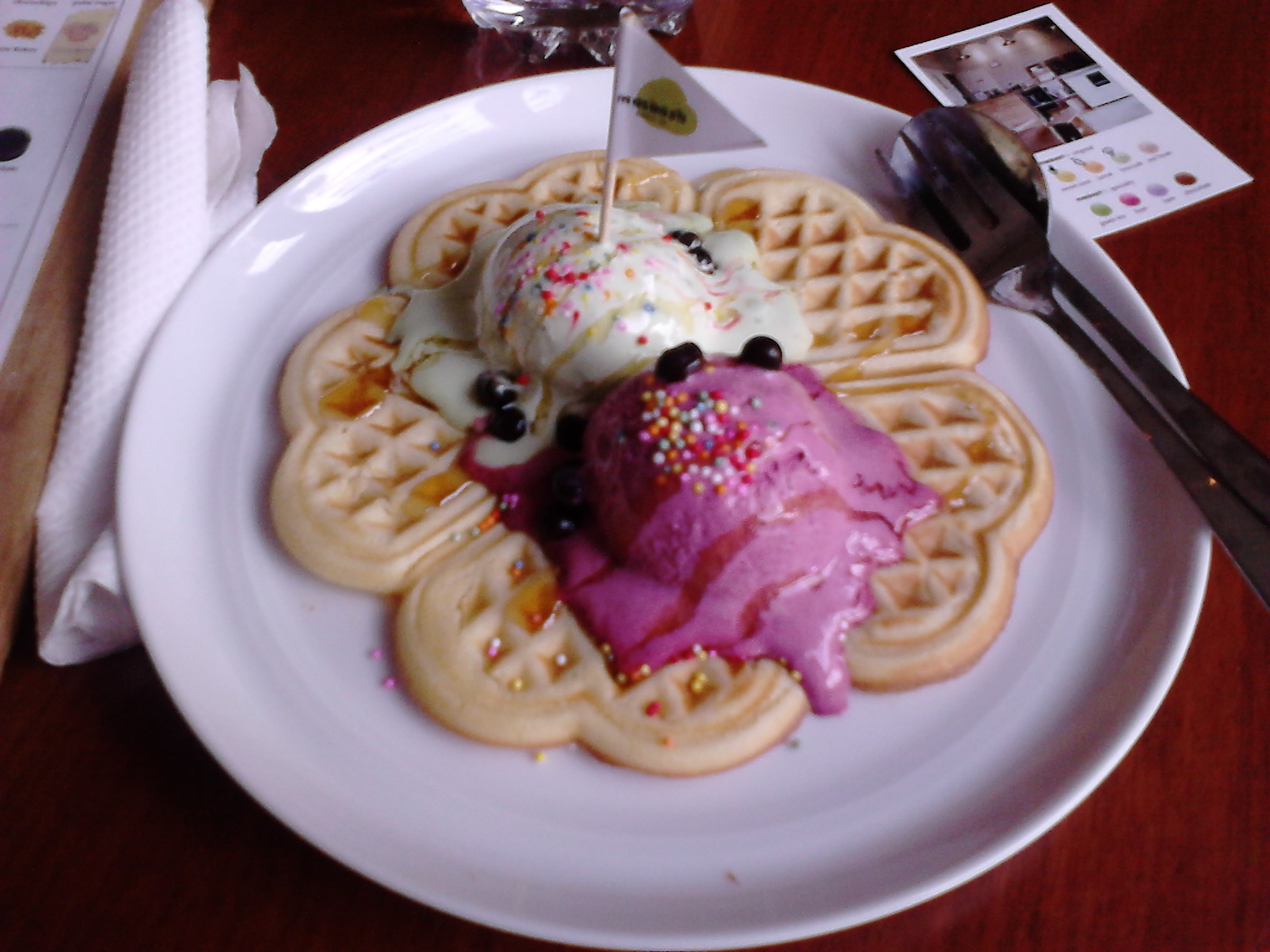 Untuk kunjungan perdana ke Masbash ini, gue pilih es krim Beet dan Green Tea dengan topping Sprinkle dan Chococip, sauce Honey, dan plate Waffle. Bonus segelas air putih dari Marsya 😀