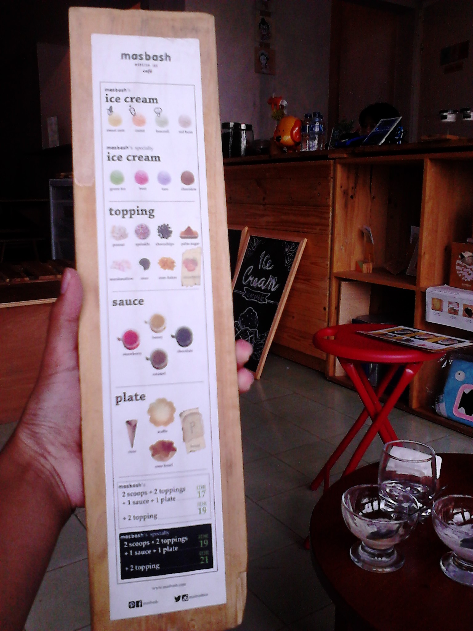 Satu paket Masbash original berisi 2 scoop es krim dengan 2 topping, 1 sauce, dan 1 plate dengan harga Rp 17.000, atau Rp 19.000 kalau mau tambah 2 topping lagi. Begitu pun untuk satu paket Masbash Specialty, tinggal tambah Rp 2.000 lagi.