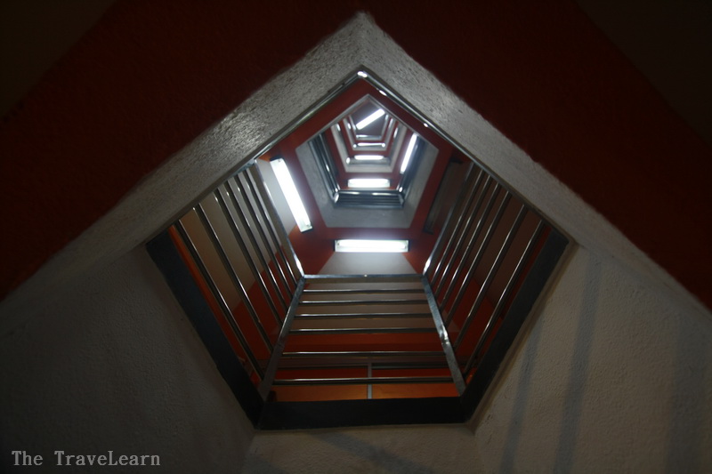 Menuju atap gedung, kami harus menaiki tangga yang berdiri tegak. Tangga tersebut menghubungkan lantai teratas (lantai delapan) dengan sebuah rongga kecil di puncak Monpera. Lalu, begitu kepala menyembul dari lubang… nyaliku langsung menciut. Pasalnya, atap Monpera ini dirancang dengan bentuk kerucut. Iya sih, ada pagar pengaman dari beton, tapi tetep aja. Berdiri di puncak gedung dengan lantai yang miring ke bawah itu horor banget!
