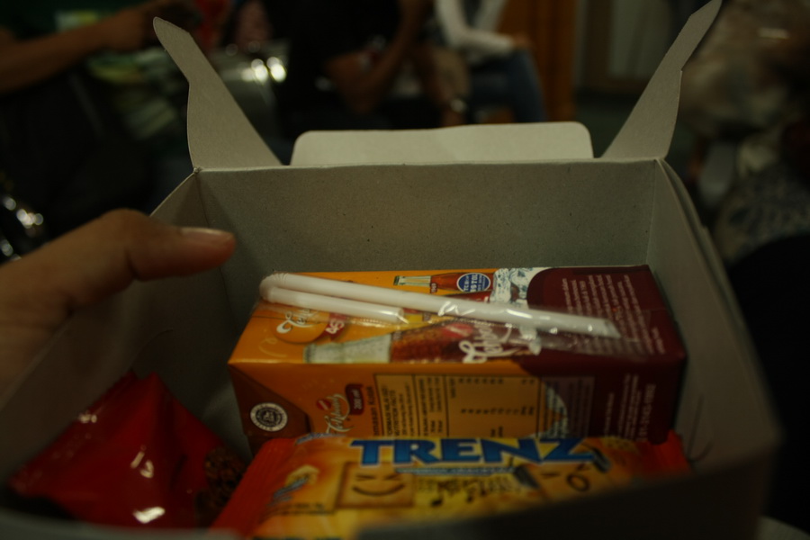 Setelah sekitar 3 jam terlunta-lunta, para calon penumpang yang resah ditenangkan dengan setangkup burger dan segelas air mineral. Tak lama kemudian, sekotak makanan ringan kembali dibagikan kepada para calon penumpang. Lumayan untuk mengganjal perut yang merintih kelaparan dan mengobati kebosanan.