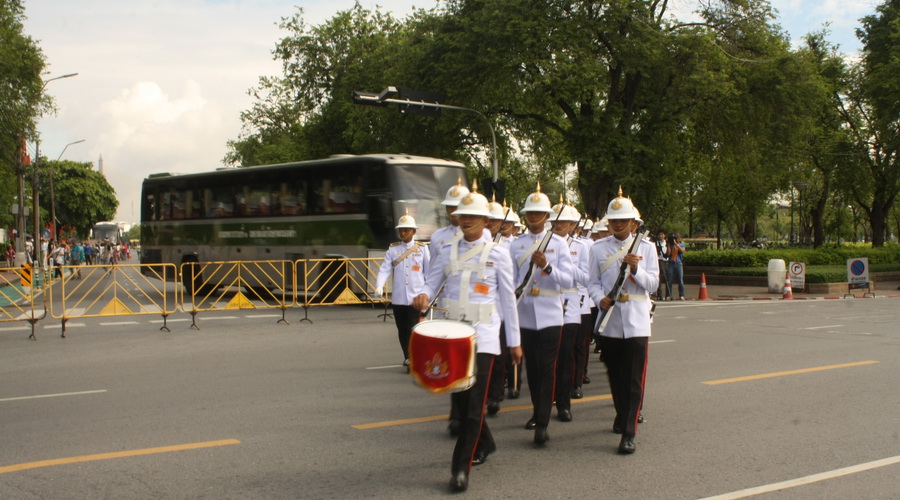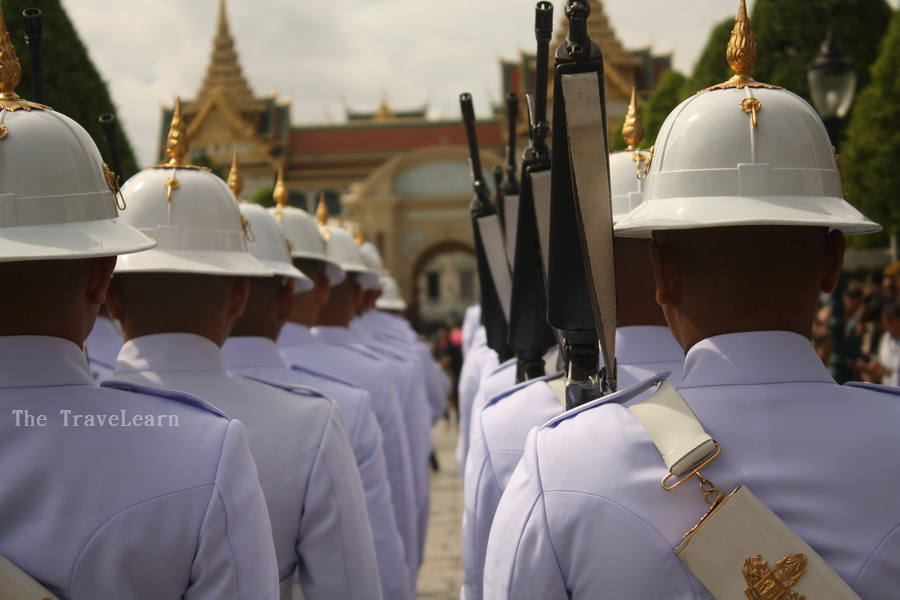Saat itu hari Senin pagi, 5 Oktober 2015. Kompleks Grand Palace masih ramai dikunjungi wisatawan, tapi setidaknya tak sepadat hari Minggu kemarin. Kami sendiri bangun agak terlambat pagi itu, pasrah tertahan di bawah balutan selimut dan semilir kipas angin kamar. Kebetulan, saat kami berkunjung, sedang ada prosesi barisan prajurit Istana dari Sanam Luang hingga memasuki Istana.