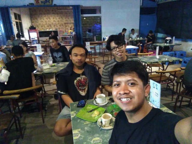 Penasaran dengan sensasi ngopi bareng warga lokal, di malam kedua ini pun gue meminta Yonky untuk membawa gue ke salah satu kedai kopi itu. Yang mana aja, terserah! Maka, usai menikmati seporsi cumi dan es cincau di Gleam Café, kami segera berpindah lapak ke jalan itu.