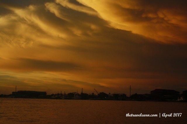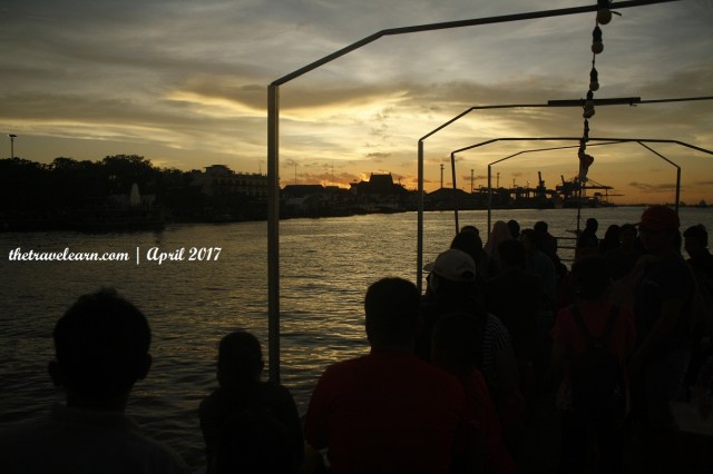 Terang matahari mulai meredup, digantikan dengan rona warna jingga yang memenuhi cakrawala. Gue terpana, seiring dengan perahu yang melejut lembut menghadap arah terbenamnya sang surya. Gelap perlahan turun merayap, membungkus gedung-gedung dan kapal di kejauhan dalam siluet.