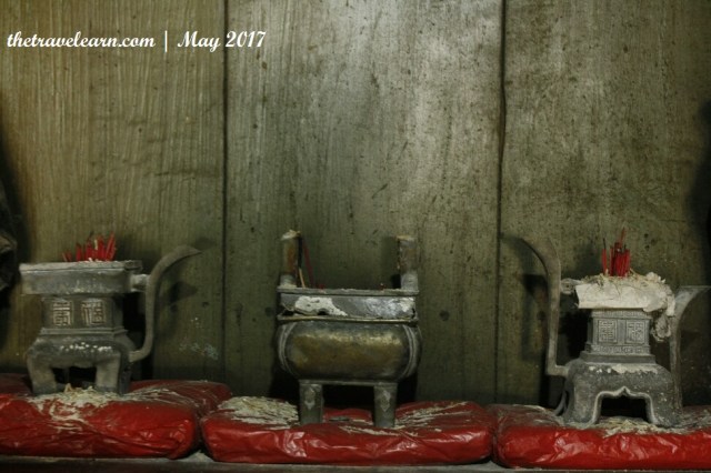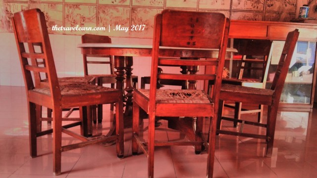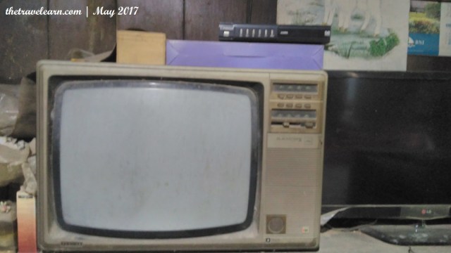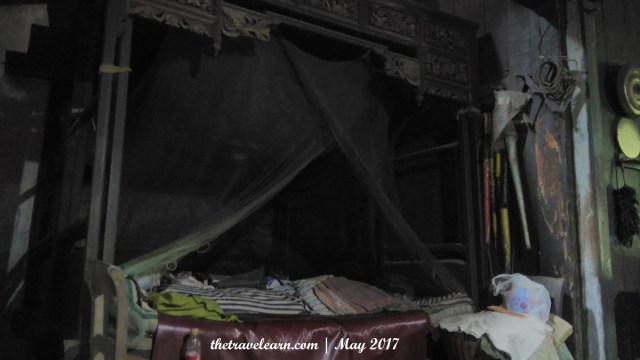 Kami lalu masuk ke bagian dalam rumah melalui pintu belakang. Sebuah ranjang dengan kelambu menjadi obyek utama yang mengisi ruangan ini. Kami berjalan lagi, dan akhirnya memasuki ruangan terdepan yang tadi dapat diakses melalui pintu depan. Di ruangan itu, ada sebuah altar untuk sembahyang, sementara beberapa potret hitam putih mengisi ruang-ruang kosong di dinding kayu. Sebuah televisi cembung hitam putih bergeming di atas meja, bersanding dengan sebuah layar desktop LG yang sedikit merusak suasana, hehe.