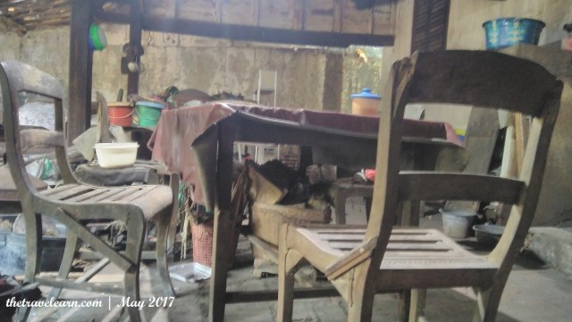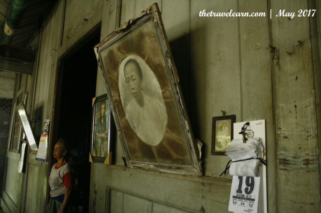 Kami dihadapkan dengan sebuah rumah berdinding kayu yang warnanya sudah pudar tergerus masa. Lantainya ubin berwarna kehitaman, di mana sebuah meja kayu dan tiga kursi dari anyaman bambu berdiri di atasnya. Sejurus dengan pintu gerbang, ada sebuah pintu lagi untuk masuk ke bagian dalam rumah, diapit oleh sepasang foto hitam putih dalam bingkai kecoklatan. Bilah-bilah kayu pada langit-langitnya ditopang oleh rangka kayu lagi yang dilumuri warna hitam pekat.