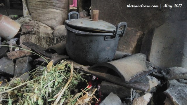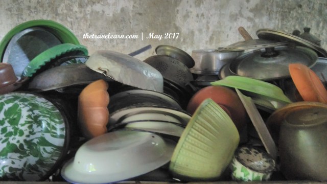 Di ruangan besar dan semi terbuka itu, piring dan mangkok dalam bermacam rupa, warna, dan material bertumpuk di atas meja. Meja dan kursi makannya berdiri kepayahan dalam balutan debu dan jelaga. Di sampingnya, asap mengepul dari ranting-ranting pohon yang dibakar di antara beberapa tumpuk bata, difungsikan sebagai alat memasak tradisional. Ember-ember dan perkakas lainnya tergeletak tak beraturan di tepi ruangan, sementara lemari kayunya berdiri merapat pada dinding yang kusam.