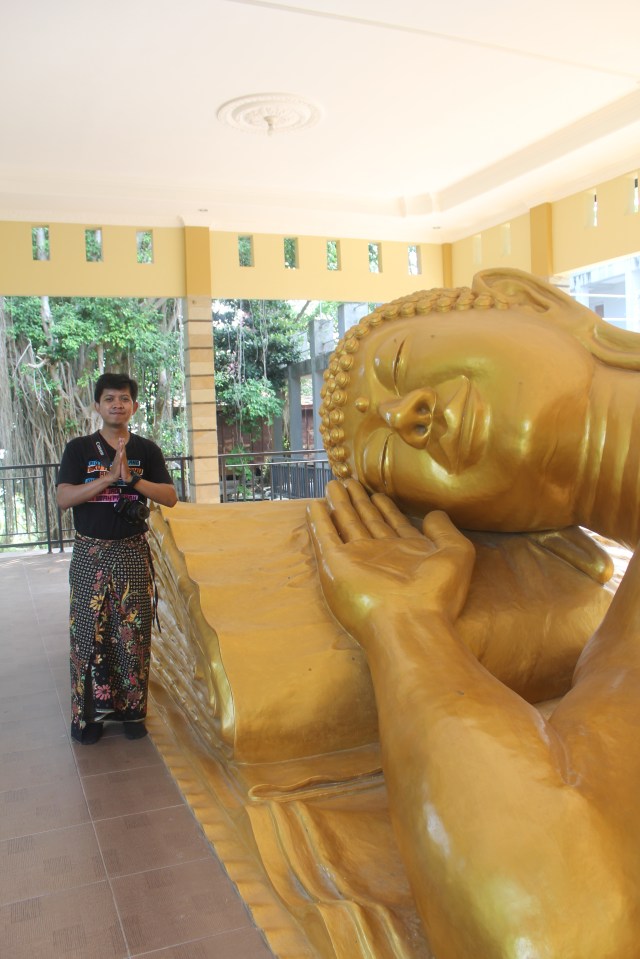 berfoto dengan patung buddha tidur / berbaring di lasem