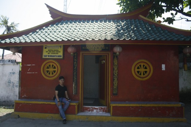 Tak cukup di situ, nuansa Tionghoa juga ditunjukkan melalui atap wallet yang menjadi mahkota megah untuk bangunan sekelas poskamling desa. Aksara kanji dan arab bersanding mesra di kedua sisi ambang pintu, mengukuhkan dua budaya yang melebur dalam peradaban warganya.