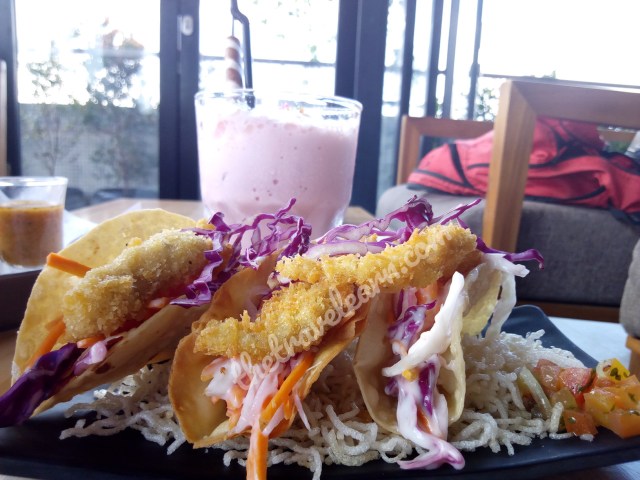 Gue memesan Fish Taco dan milkshake Red Velvet, sementara mas Arie memilih Ayam Asian Going West dan milkshake Taro yang penampilannya nyaris sama dengan Red Velvet.