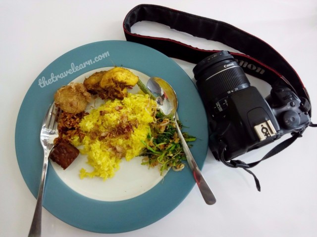 Keseluruhan acara pun ditutup dengan foto bersama, dan masing-masing blogger pulang dengan menenteng goody bag berisi bantal biru khas Ibis Budget yang lucuk. Sebelum check-out, para peserta dipersilakan untuk bersantap siang dengan nasi kuning yang sudah disediakan. Lauknya lengkap! Ada ayam goreng, perkedel, tempe, dan urap.