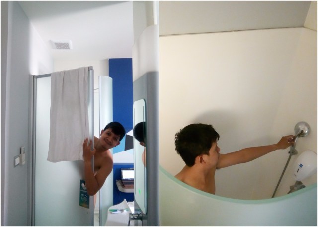 Bilik pancuran dan toilet tidak disatukan dalam 1 kamar kecil, breaking news buat kamu yang suka rebutan WC sama partner kamar kamu! Kepala pancurannya juga unik karena dapat mengeluarkan cahaya berwarna biru. It was my first time seeing such thing, hahaha. Sisi dinding bilik pancuran yang menghadap ke area tempat tidur memang agak transparan, tapi ternyata masih aman kok, “harta karun” kamu yang paling berharga nggak akan bisa dilihat oleh teman menginap.