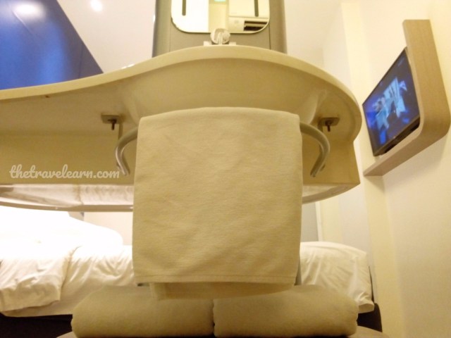 Gue suka banget sama penataan ruangnya. Wastafel diletakkan di tengah ruangan, di antara area tempat tidur dan kamar mandi, lucuk! Di bawah wastafel ada tempat sampah dan colokan listrik. Di belakang wastafelnya sendiri terdapat sebuah meja memanjang tempat meletakkan air mineral dan gelas-gelas.