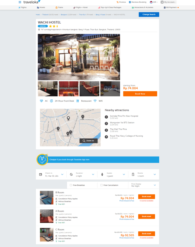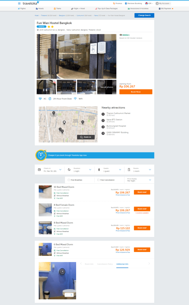 Total harga untuk 2 malam (30 Maret – 1 April 2018) cuma Rp331.499,00 aja di Traveloka. Gue sempet bandingin harganya sama online travel agent lainnya yang berskala internasional dan khas dengan warna biru tua (ehehehe). Ternyata yang di Traveloka lebih murah dong. Di OTA sebelah, harga per malam buat Mixed Dormitory di tanggal yang sama Rp180.000-an, sementara Standard Room sampai Rp900.000-an. Nggak salah emang gue pilih Traveloka dari awal. Harga di aplikasi malah bisa lebih murah lagi, tapi gue udah kagok buka di laptop sik, hahaha.