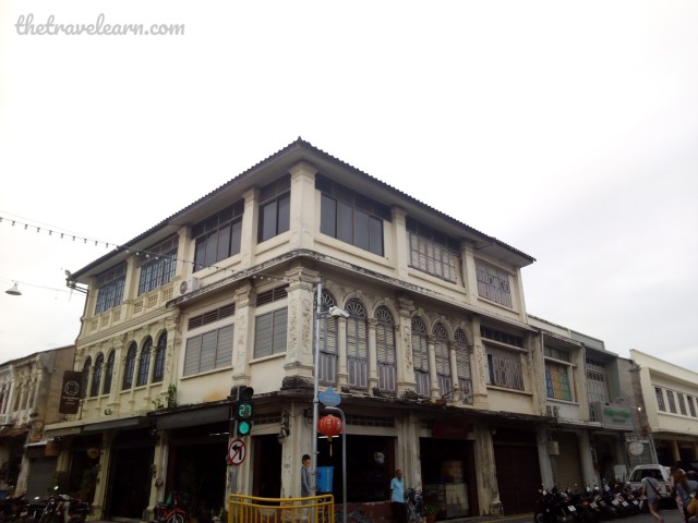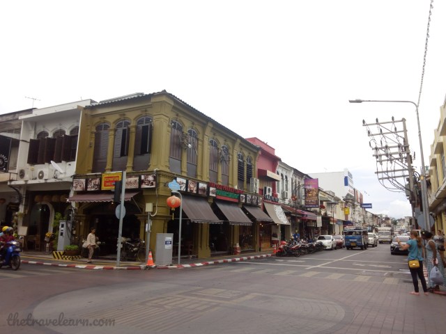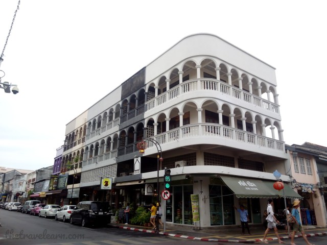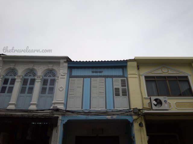 Saat ini, kepingan-kepingan masa lalu tersebut dapat kita lihat di Phang Nga Road (Thanon Phang Nga) dan sekitarnya. Jalan-jalan sempitnya diapit oleh deretan ruko-ruko Sino-Portuguese setinggi 2 lantai, dibalut dengan warna-warna cerah. Atap-atap lengkungnya yang khas Tionghoa berpadu dengan pilar-pilar dan struktur bangunan bergaya Portugis. Gue nggak tahu bangunan-bangunan apa aja yang kami lalui, tapi sebagian di antaranya difungsikan sebagai café. Sayangnya saat itu lagi bener-bener nggak laper, padahal rencana awalnya memang mau ngopi-ngopi di situ.
