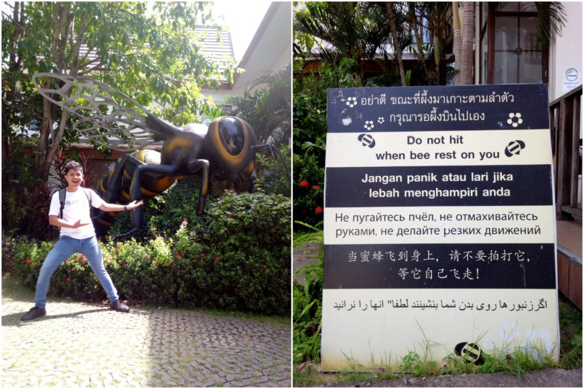 Big Bee Farm terletak di antara Bangkok dan Pattaya, jadi memang cocok agenda kunjungannya ditempatkan di urutan pertama (atau terakhir). Di bagian depan, ada patung lebah raksasa yang, tanpa disuruh, langsung jadi spot berfoto sejuta umat. Inget ya, gue nggak cuma traveling berempat, kami ikut tur bareng rombongan buibuk dan pakbapak, terus ada 2 kelompok kecil anak-anak muda sebaya, dan sepasang suami istri. Eh, ternyata sampai sekarang gue masih inget mereka semua.