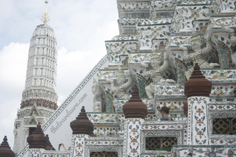 Yaksa-yaksa dengan ukuran yang lebih kecil mengelilingi tiap menara dengan pose menyangga. Di lapisan yang lebih tinggi, ditempatkan patung Dewa Indra (disebut Dewa Erawan oleh masyarakat Thai) di setiap arah mata angin. Inilah kenapa gue sebut Wat Arun sebagai kuil perpaduan Hindu dan Buddha.