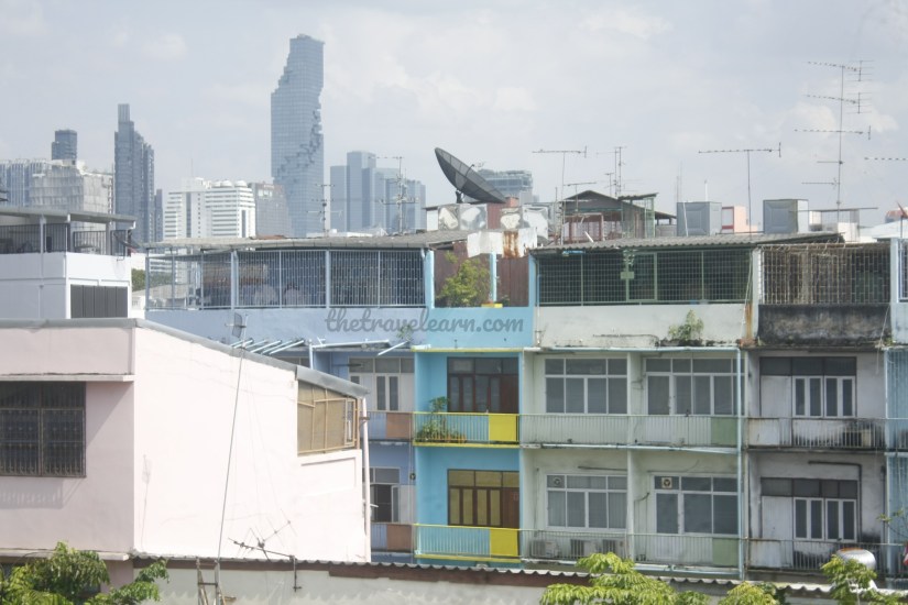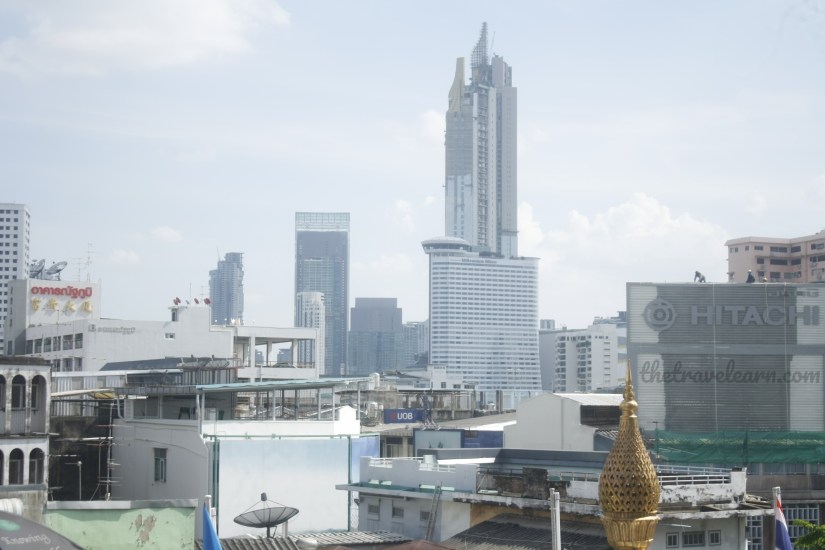 Di tiap lantai, gue selalu berhenti buat menikmati pemandangan yang tersaji. Sebagai seorang penjelajah kota, gue selalu senang mengamati panorama kota dengan gedung-gedung bertingkatnya. Selain gedung-gedung di sekitarnya yang nggak terlalu tinggi, berbekal kamera DSLR, gue bisa mengabadikan gedung gedung pencakar langit Bangkok, termasuk Maha Nakhon sang gedung tertinggi, yang ada di kejauhan sana. Gue juga bisa melihat gerbang pecinan yang megah dan persimpangan jalan yang manis seperti kota-kota Indocina (Phnom Penh, Ho Chi Minh City, dsb)