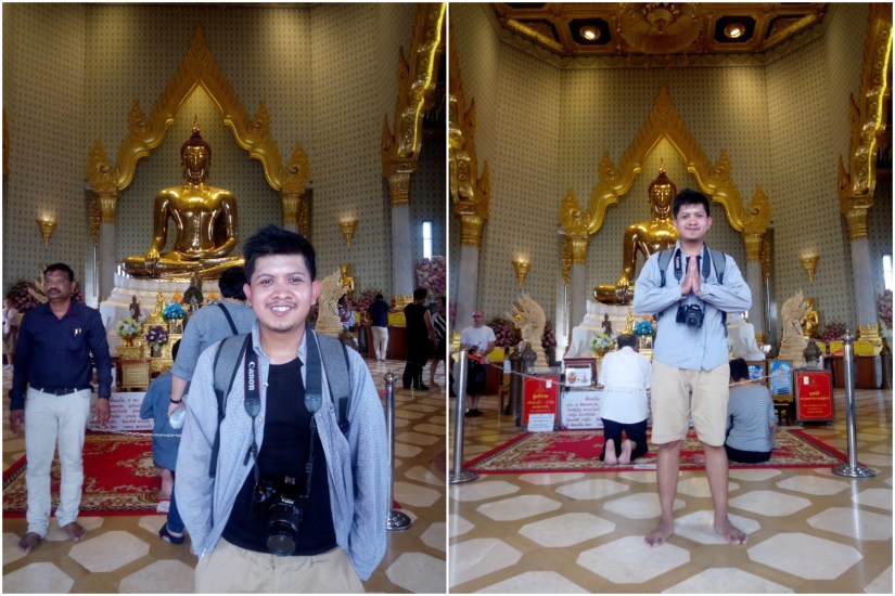 Seperti tempat-tempat sebelumnya, di kuil utama Wat Traimit ini gue juga bertemu dengan… turis-turis India. Gue harus nunggu beberapa saat supaya bisa foto dengan “bersih”. Bahkan gue sampai ambil foto 2 kali, yang pertama minta tolong sama mbak-mbak pengunjung yang lagi lesehan di sudut ruangan, lalu yang kedua minta tolong ke Antika karena pas lagi sepi. Gue sampai jadi peserta tur yang terakhir masuk bus karena kelamaan foto-foto.