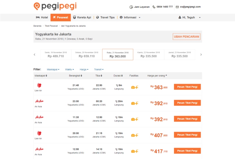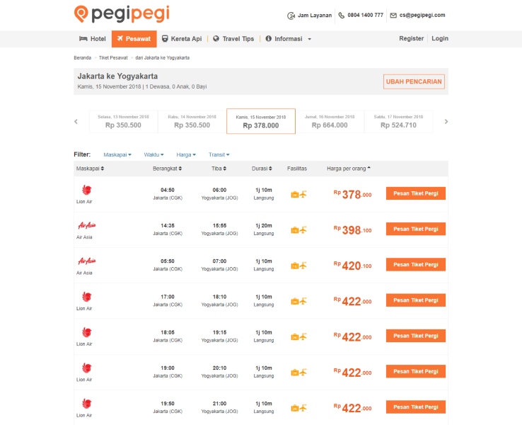 Gue cek di Pegipegi, tiket Jakarta-Jogja buat keberangkatan hari Kamis, 15 November 2018 cuma Rp378.000 aja lho! Tiket pulangnya buat hari Rabu, 21 November 2018 juga cuma Rp363.000. Berangkat pake penerbangan pagi-pagi, pulang pake penerbangan paling malem, puas-puasin dah di Jogja! Belum dipotong promo khusus yang lagi berlaku di Pegipegi. Tanggal 20-nya libur, jadi tinggal cuti 4 hari. Intinya, carilah penerbangan di hari anti-mainstream dan jadwal anti-mainstream.