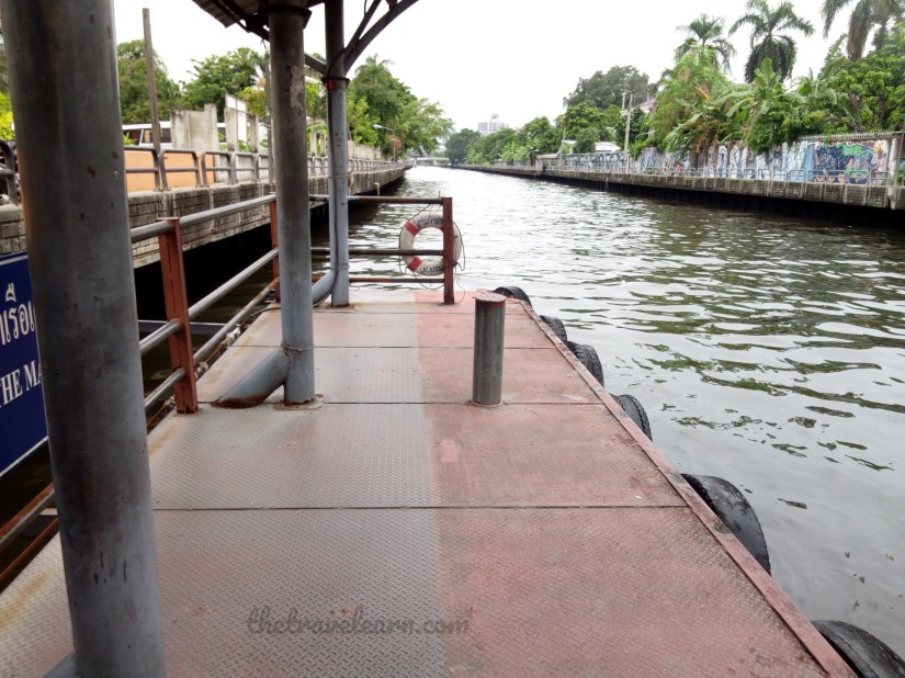 Gue cukup amazed karena ternyata ada papan informasi rute di dermaga, walau ternoda aksi vandalisme. Kehadirannya memperteguh informasi yang gue peroleh dari Google Maps. Dermaganya simpel, tapi rapi dan bersih. Saat udah di dermaga itulah, gue baru sadar kalau ternyata kanal-kanal di Bangkok itu agak bau juga hehe, meski nggak semenyengat bau kali di Jakarta. Minimal, sungai dan kanal-kanal di Bangkok tetap mengalir lancar tanpa terhambat limbah rumah tangga, sampah masif pun nggak terlihat. Yah, kalo sampah tipis-tipis mah masih ada.