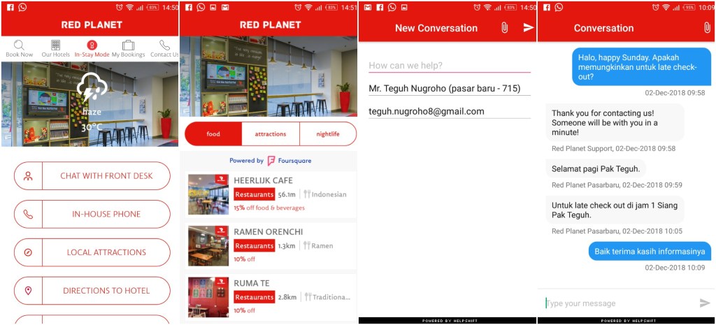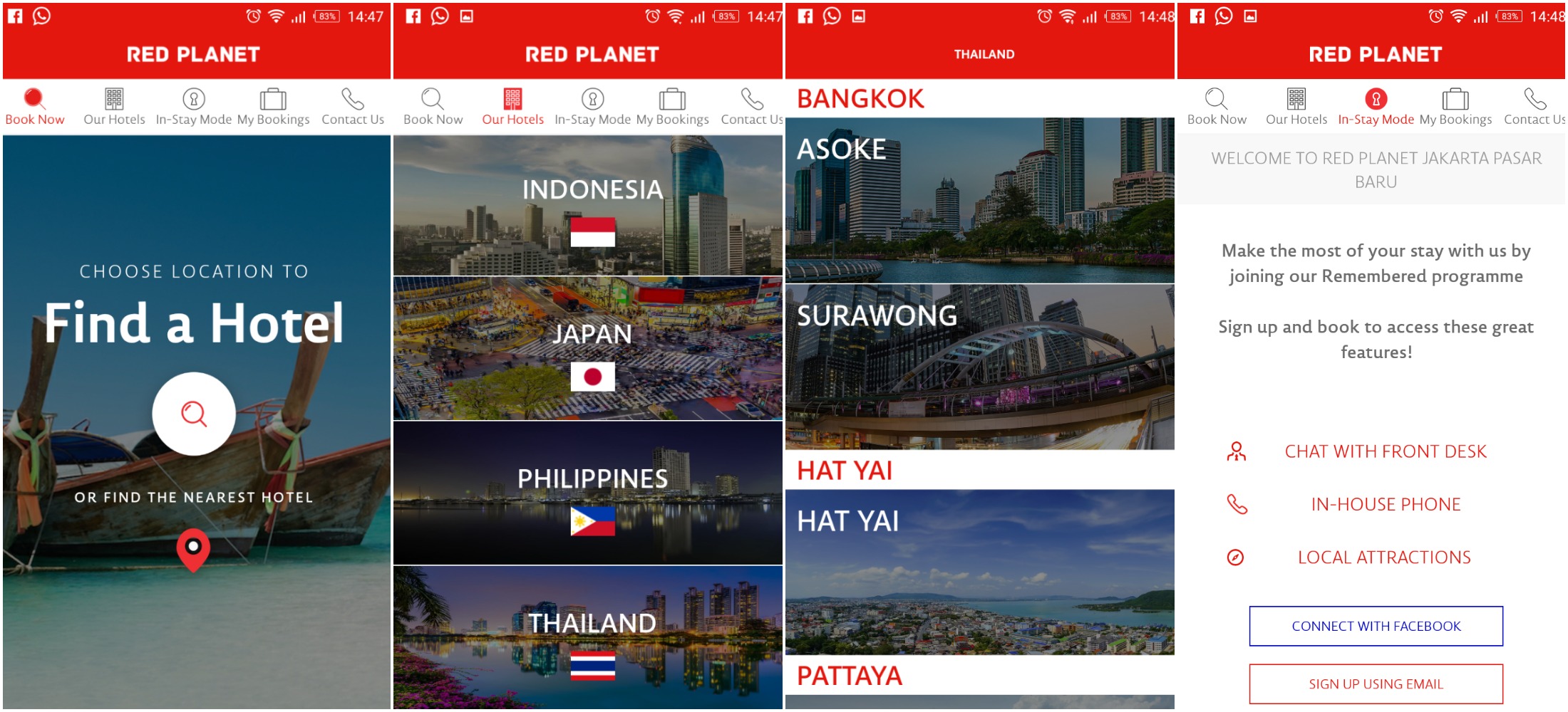 Interface dan menu-menu aplikasi Red Planet Hotels