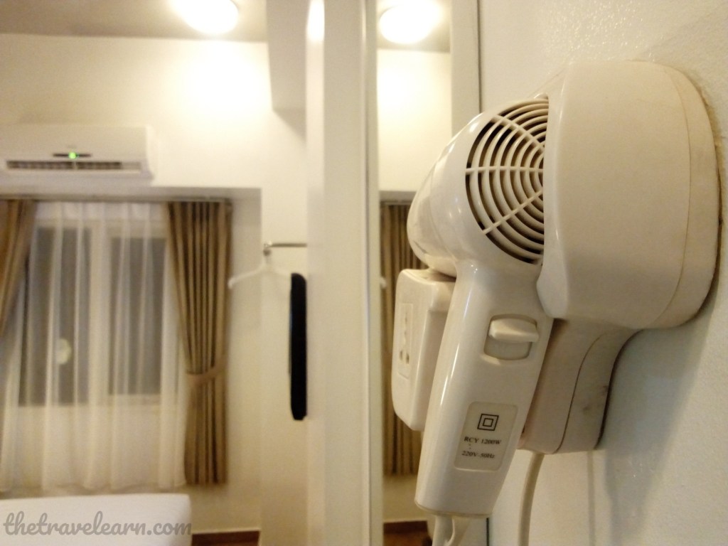 Persis di depan pintu kamar mandi, ada cermin memanjang yang ideal buat berkaca setelah mandi. Sebuah hair dryer tergantung di sampingnya, lengkap dengan colokan listrik. Akses untuk mengatur AC dan kipas angin ada di samping pintu kamar mandi. Sebuah cermin yang memanjang secara horizontal juga ditempatkan di atas headboard ranjang.