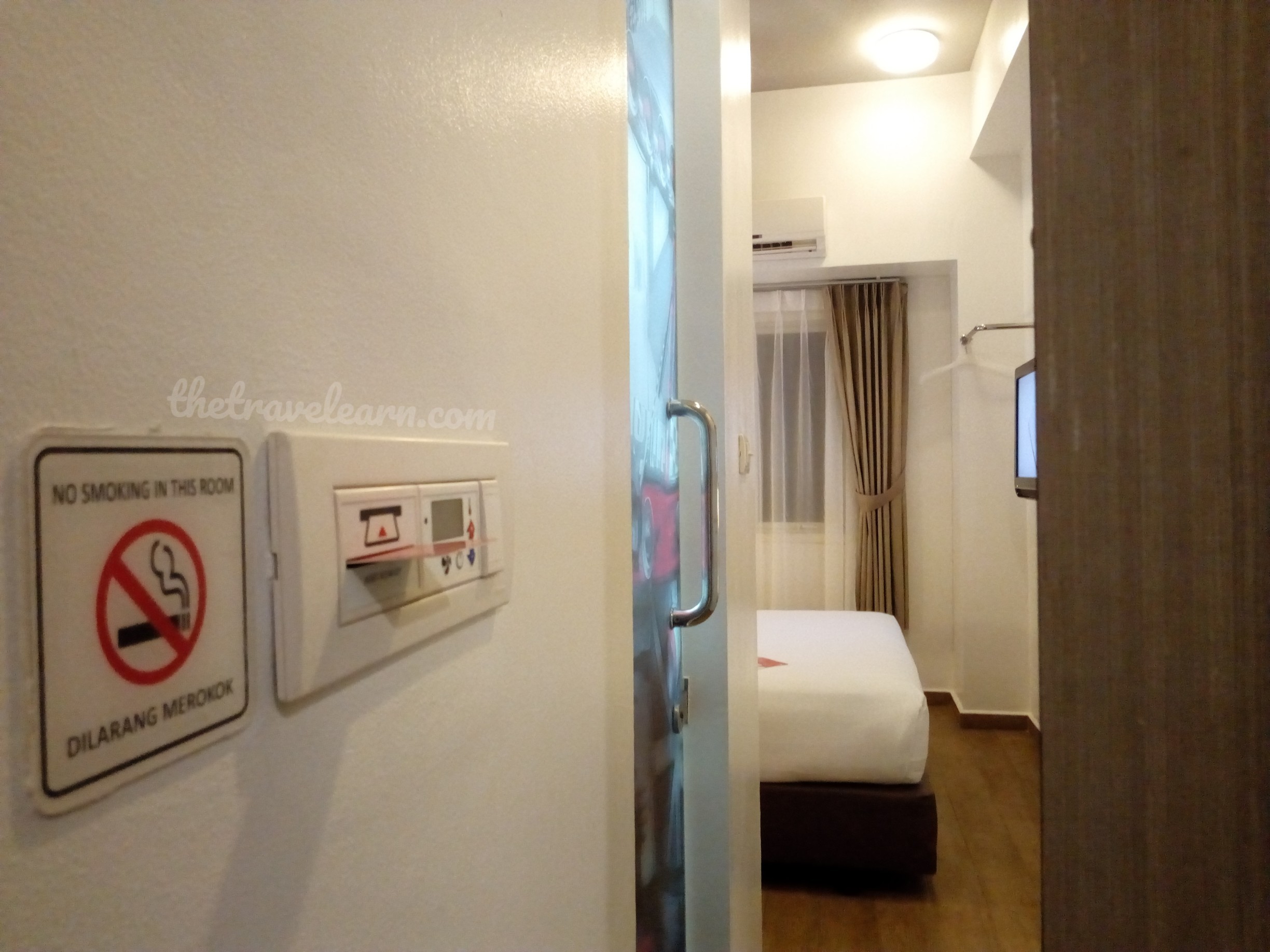 Ranjangnya yang bersih dan rapi diapit oleh sepasang meja kecil. Meja kecil di sebelah kiri menjadi tempat diletakkan sebuah majalah, sementara 2 buah complimentary water ada di meja sebelah kanan. Safety box ditempatkan di celah kosong meja sebelah kanan. Di sisi kiri ranjang, menempel dengan dinding kamar mandi, tersedia meja kayu lipat dan kursi sederhana tanpa armrest dan sandaran. TV layar datar ditata dengan strategis di hadapan tempat tidur.