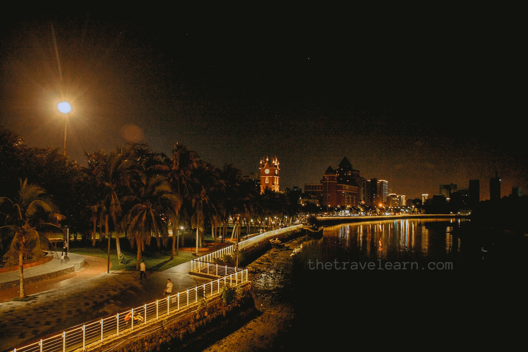 Haidian River yang bersih sangat menyenangkan untuk dinikmati sembari berjalan santai dari sore hingga gelap merayap. Kita bisa berjalan dengan aman dan nyaman di jalur pejalan kaki yang lebar, bersih, dan cantik di sepanjang sungai. Karena mengalir dari barat ke timur, panorama matahari terbenam di Haidian River adalah salah satu yang terbaik di Hainan! Gue rasa untuk menikmati matahari terbit pun bisa juga di sini. Lalu saat malam, suasana menjadi kian teduh dan romantis. Beberapa warga lokal meramaikan suasana dengan duduk santai, jalan-jalan, jogging, dan bersepeda.
