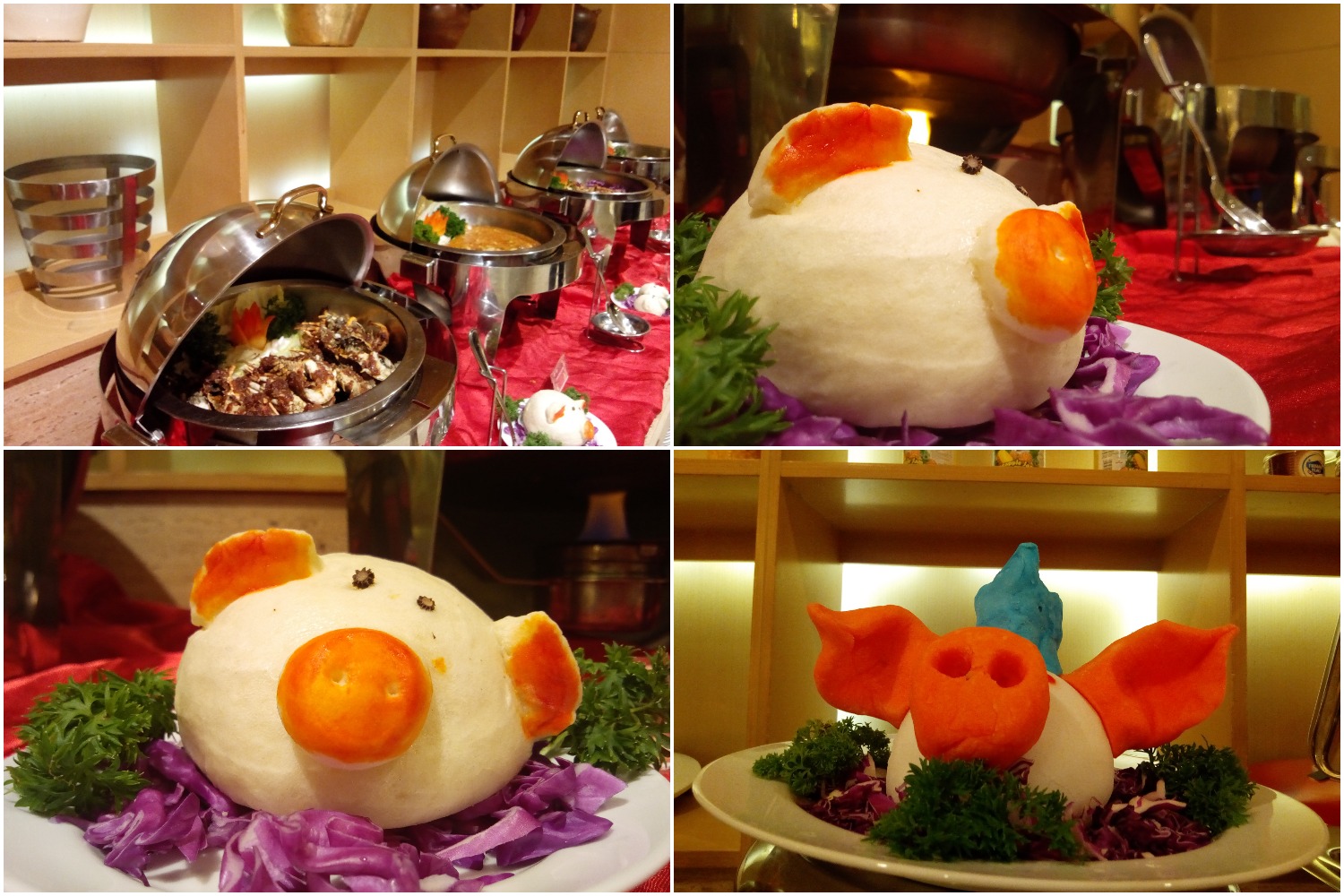 Selain itu juga ada Bebek Goreng Peking yang khas sebagai hidangan Tionghoa, 2 area main dish dengan menu berbeda-beda, dan kayaknya ada sudut yang belum gue jamah juga kalo denger cerita temen-temen yang menemukan bakso. Di area main dish, ada piggies-piggies yang lucu bangeeettt, sesuai dengan Tahun Babi Tanah yang saat ini kita masuki. Sayangnya gue malah lupa buat icipin Bebek Peking-nya, huhuhu. Tapi gue udah berusaha menikmati main dish dan desert sebaik-baiknya. Gue ambil macam-macam daging, dimsum, Lontong Cap Go Meh, telur kecap, dan sambal goreng krecek.
