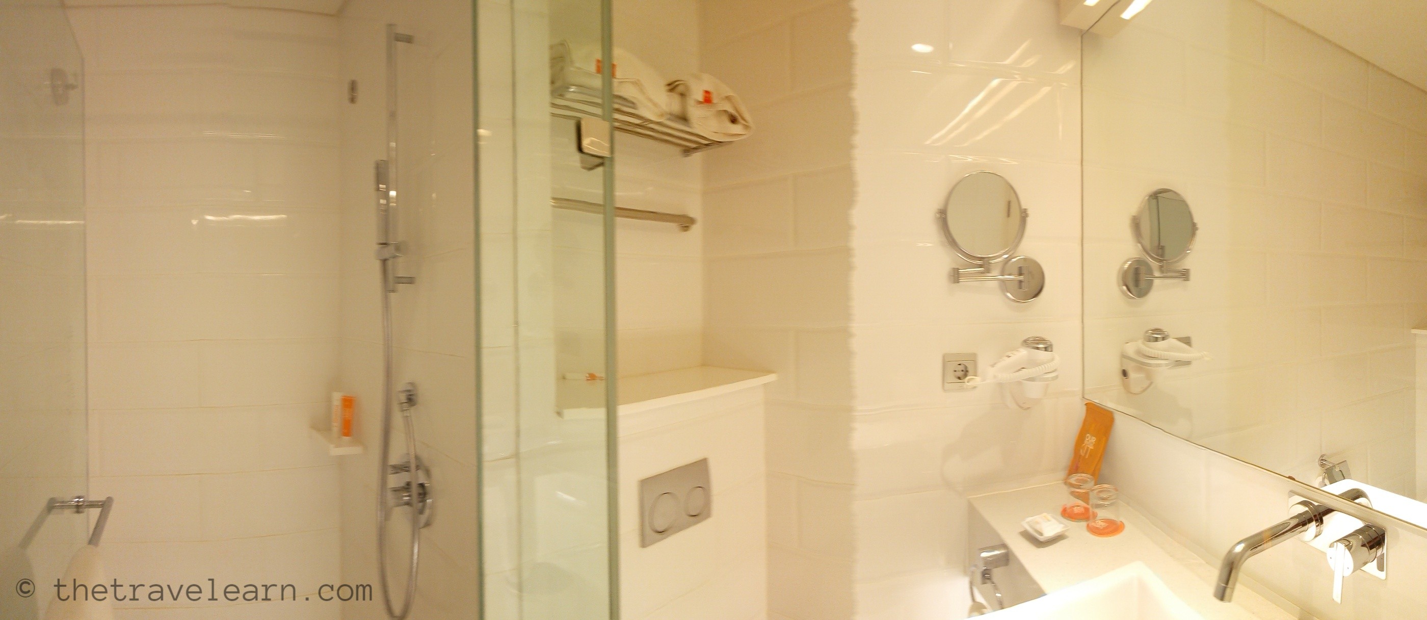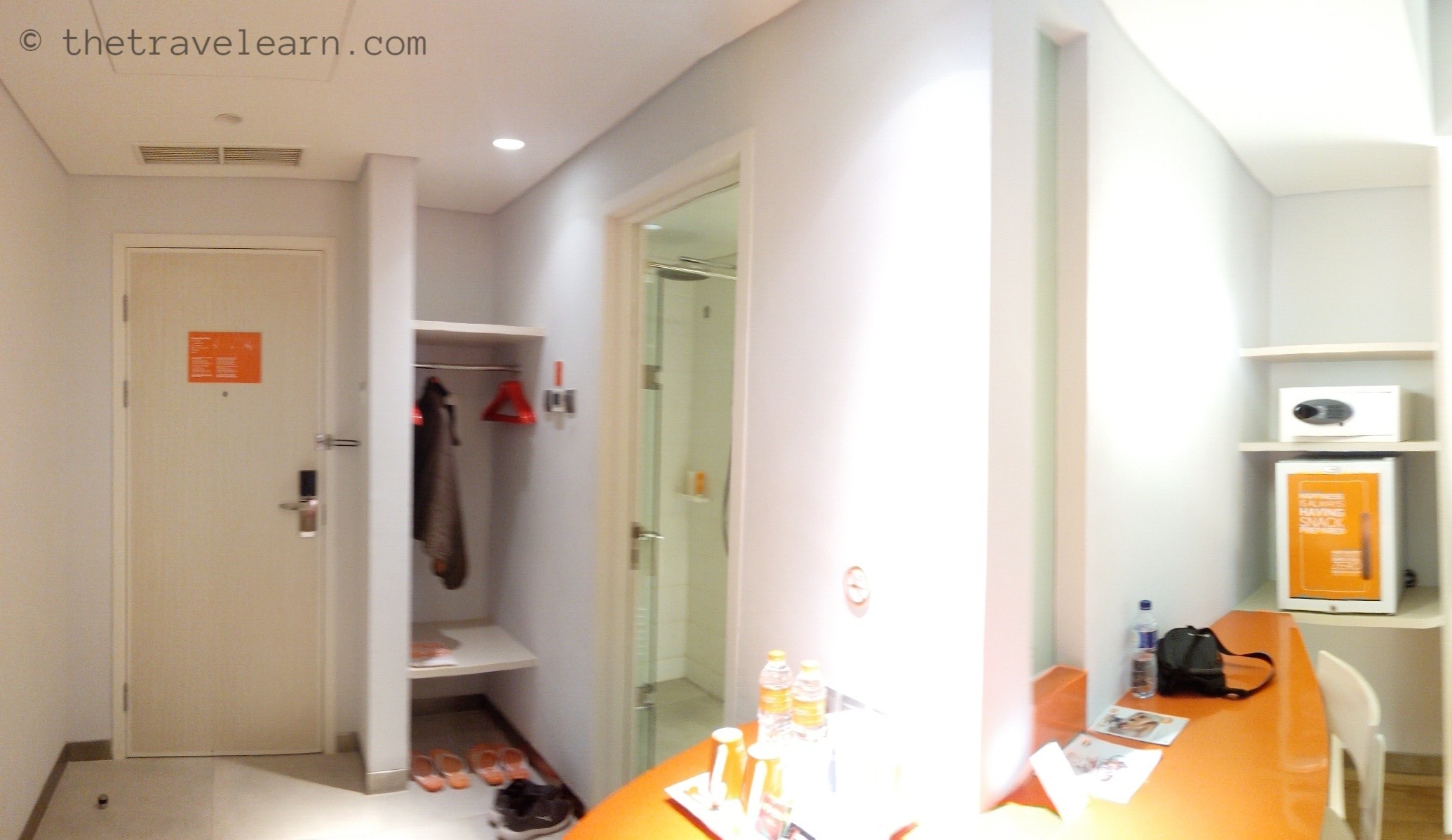 Hal pertama yang ditemukan begitu melangkahkan kaki masuk ke dalam kamar adalah kehadiran hanging corner dan kamar mandi yang ada di sisi kiri entryway. Di hanging corner sudah disiapkan beberapa hanger dan sepasang slippers (sandal). Kamar mandinya lega! Area basah dan area kering dipisahkan oleh dinding kaca berpintu seperti yang gue temukan sebelumnya di Hotel Ibis Jakarta Kemayoran, jadi kalo mandi airnya nggak menodai area kering.