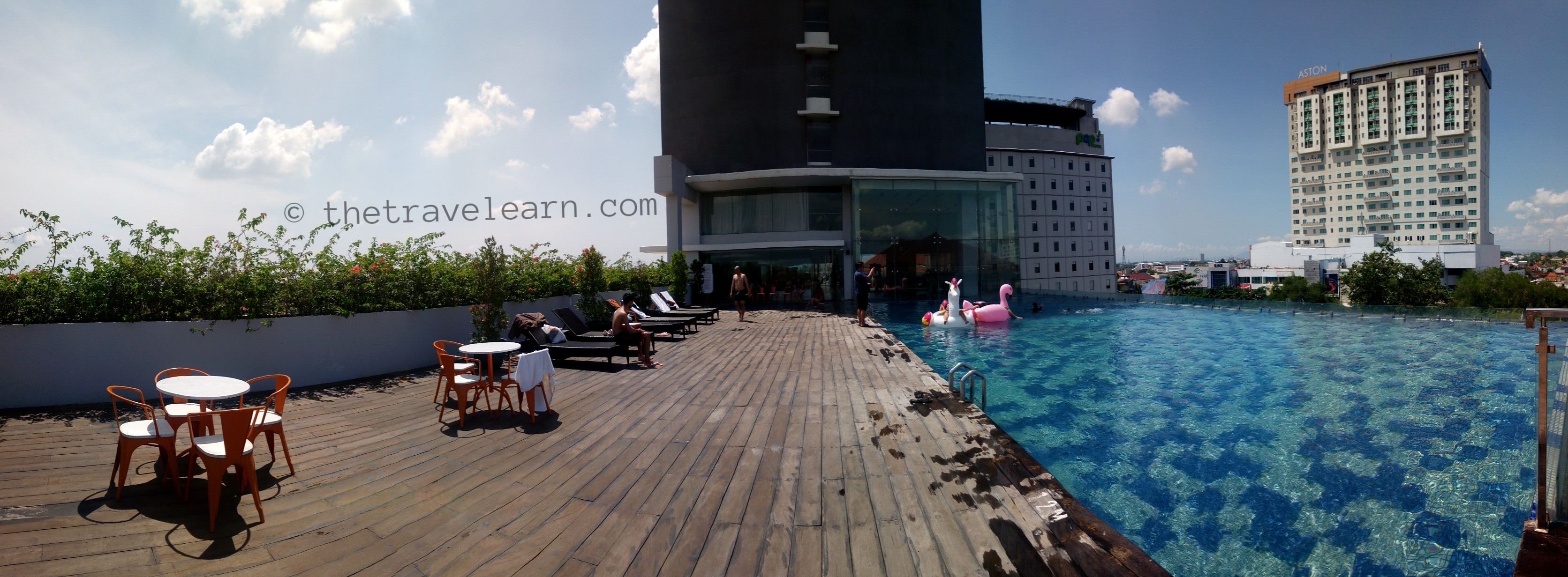 Kolam renangnya cukup luas dengan air yang bersih dan dasar kolam yang berwarna biru sehingga tampil sangat mengundang! Meski hanya di lantai 3, tapi pemandangan dari kolam renang cukup bagus lho! Selain itu, kolam renang dikonsep dengan gaya infinity pool yang kekinian dan instagrammable. Rasanya ngeri-ngeri sedep saat berada di tepi, hehe. Beberapa flatbed dan meja-kursi ditempatkan di salah satu sisinya untuk sudut bersantai pengunjung. Selain kolam utama, juga ada satu kolam Jacuzzi kecil.