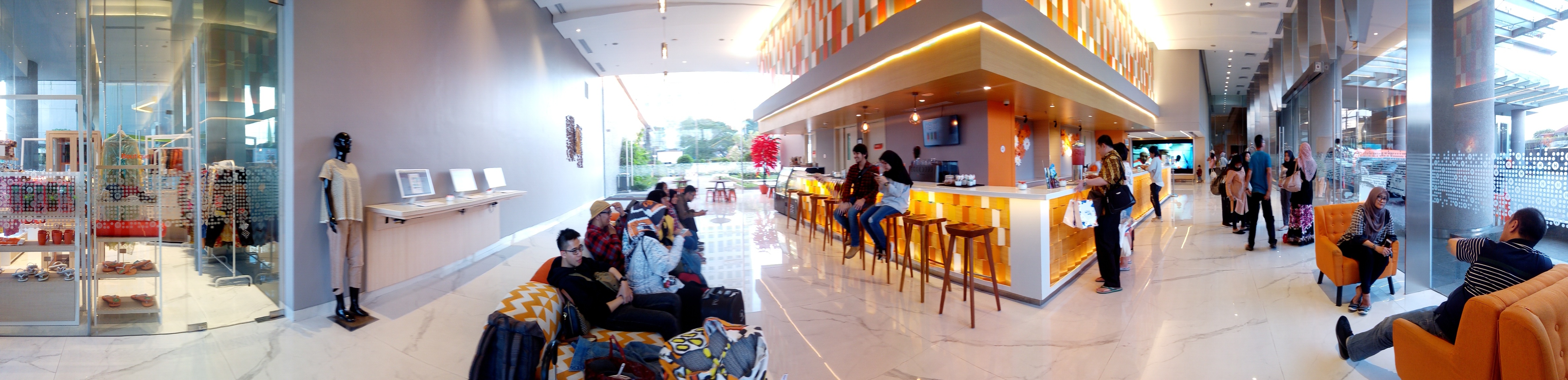 Lobinya luaaasss. Aplikasi dinding kaca dari kedua sisinya membuat lobi HARRIS Hotel Solo berlimpah cahaya alami. Lantainya tampil elegan berkat aplikasi material marmer. Front desk bar-nya dibuat 2 sisi, dilapisi aksen warna oranye dengan motif geometri untuk sentuhan segar dan artistik. Beberapa kursi bar dijejerkan di salah satu sisi meja sebagai tempat tamu duduk bersantai. Ada welcome drink yang bebas dinikmati di front desk, sementara di sampingnya tersedia semacam bakery kecil yang menjual beberapa macam kue dengan harga Rp20.000-an. Agak mahal untuk ukuran Solo, tapi kalo kamu tinggal di Jakarta atau Bandung dan lagi mager maksimal, harga tersebut masih dirasa layak lah.