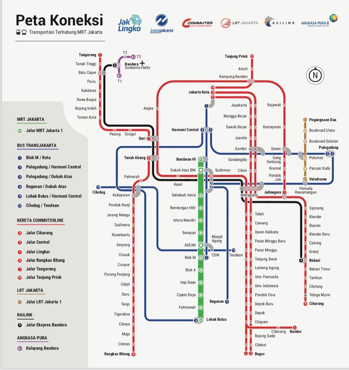 Current map for MRT Jakarta, airport rail service, LRT Jakarta, KRL Commuter Lines, and some TransJakarta busway lines