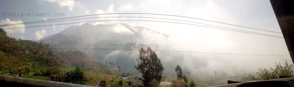 Sepanjang perjalanan, gue yang duduk di kursi depan (sepanjang trip gue selalu duduk di kursi itu sih) dibuat terkesima dengan keelokan panorama Dieng! Gunung Sindoro setia membayangi dengan gagah. Petak-petak sawah dan ladang penduduk di lahan yang bergunung-gunung mengisi pandangan di sisi kiri dengan lapisan kabut yang masih berarak tipis. Yang lain pada asyik ngobrol, gue sibuk mengambil foto dan video. Ah, Dieng, ini sungguh sebuah ucapan perpisahan yang manis…
