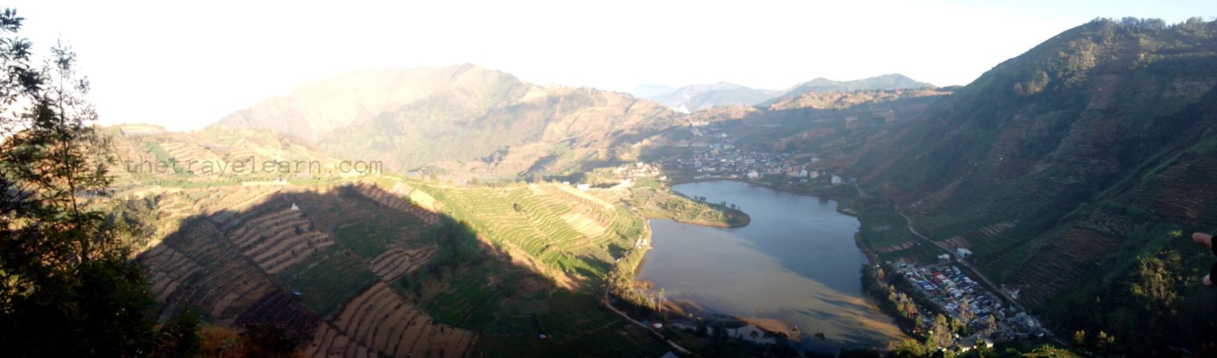 Dalam perjalanan kembali ke bawah, kami berfoto di 2 spot lainnya, salah satunya menawarkan pemandangan Telaga Cebong (ya, walaupun nggak cakep-cakep amat sih). Saat udah di bawah, kami akhirnya sarapan di salah satu warung terbuka hehe. Sederhana, hanya mendoan dan kentang, tapi kenikmatannya membuat lidah bergoyang. Untuk kembali ke tempat parkir mobil kami, kali ini kami memutuskan buat naik ojek seharga Rp10.000/orang atau Rp15.000/2 orang dalam 1 ojek.