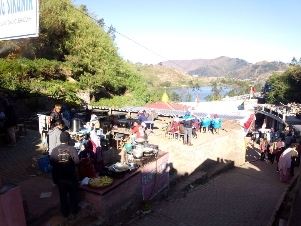 Di sepanjang jalan kecil dari tempat parkir utama menuju undak-undakan, warung-warung makan dan kedai oleh-oleh berjajar, beberapa di antaranya bahkan mengolah makanannya begitu saja dengan terbuka. Ah, perut yang kosong ini harus susah payah menahan godaannya.