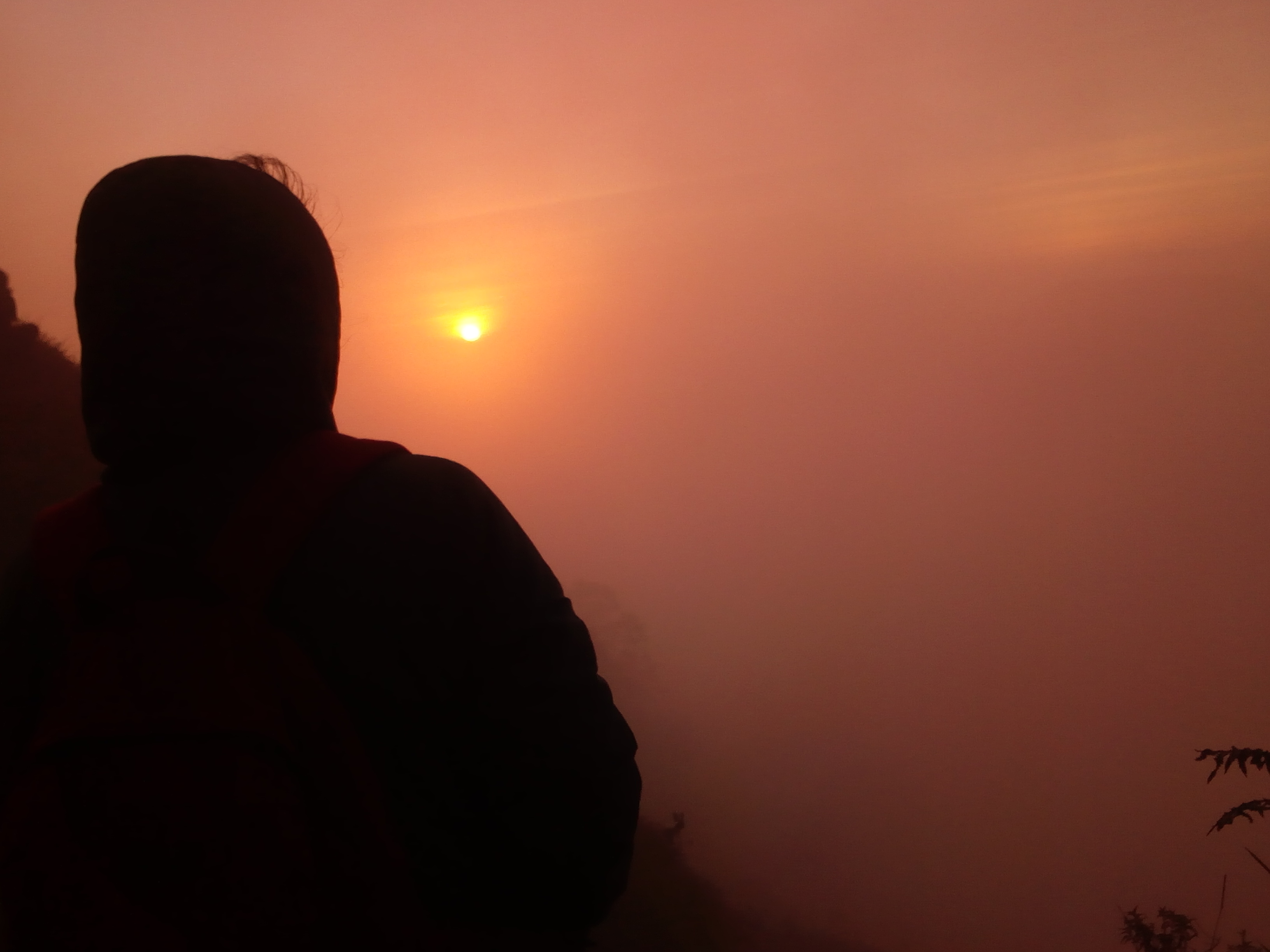 Sampai di puncak, ternyata berkabut dooonggg! Nyaris nggak kelihatan apa-apa selain cahaya oranye yang menembus lemah lapisan kabut. Sesekali lapisan kabut tersibak, membuat harapan kami melihat sunrise kembali mencuat. Tapi begitu sudah ancang-ancang buat foto, eh kabutnya balik lagi. Sambil menunggu lapisan kabut berangsur-angsur lenyap (Sanny tetep antusias foto-foto dengan bantuan mas Himin), gue hanya tertawa di dalam hati, Tuhan seperti mengajak bercanda. Dari dulu, gue nggak pernah berhasil menyambut sunrise saat gue sengaja berburu untuk menemuinya. Tapi saat nggak dicari, dia muncul begitu saja di garis horizon.