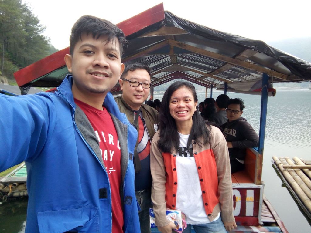 Perahu berderak pelan mengitari telaga dengan tenaga motor. Tak lama setelah perahu berjalan, 3 orang anak muda lalu mengisi bagian depan perahu untuk foto-foto. Untungnya mereka tau diri hahaha, nggak menyabotase spot itu sepanjang perjalanan. Begitu mereka kembali ke bangku penumpang, gue dan Sanny lalu buru-buru mengisi kekosongan.
