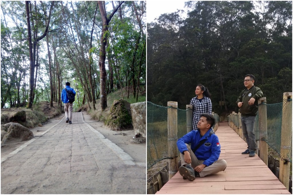Ada 2 spot yang menjadi lokasi foto-foto kami di area Telaga Warna dan Telaga Pengilon ini. Yang pertama adalah semacam dermaga kayu di tepi telaga, yang kedua adalah di atas jembatan gantung. Buat bisa foto di dermaga, kami juga harus antre. Setelah itu, kami buru-buru keluar sebelum Candi Arjuno tutup.