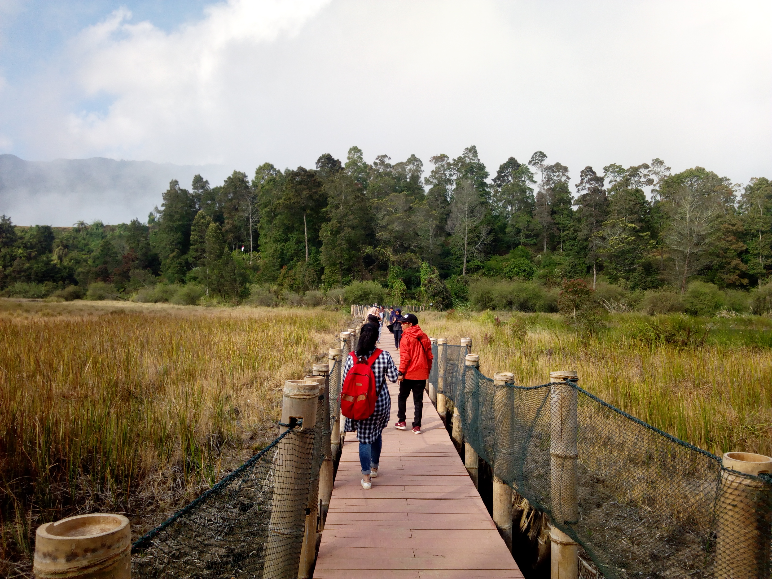 Kami berjalan lurus mengikuti jalan yang disediakan, menyusuri tepian telaga, lalu berbelok ke kiri menuju jembatan. Nah, dalam perjalanan menuju jembatan, gue malah tertarik dengan padang rerumputan liar di lahan gambut. Gue lalu mengajak mereka turun, dan jadilah kami foto-foto di situ haha. Dari yang tadinya cuma kami sendiri, lalu diikuti oleh kelompok wisatawan yang lain.